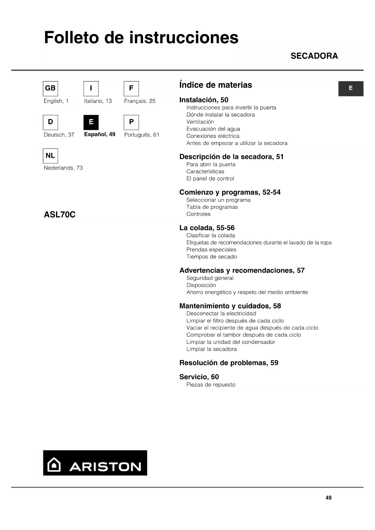 Seriennummer (S/N) Diese Informationen können Sie dem Typenschild an der Türinnenseite der Maschine entnehmen.Índice de materias SECADORA ASL70C Folleto de instrucciones Instalación, 50 Instrucciones para invertir la puerta Dónde instalar la secadora Ventilación Evacuación del agua Conexiones eléctrica Antes de empezar a utilizar la secadora Descripción de la secadora, 51 Para abrir la puerta Características El panel de control Comienzo y programas, 52-54 Seleccionar un programa Tabla de programas Controles La colada, 55-56 Clasificar la colada Etiquetas de recomendaciones durante el lavado de la ropa Prendas especiales Tiempos de secado Advertencias y recomendaciones, 57 Seguridad general Disposición Ahorro energético y respeto del medio ambiente Mantenimiento y cuidados, 58 Desconectar la electricidad Limpiar el filtro después de cada ciclo Vaciar el recipiente de agua después de cada ciclo Comprobar el tambor después de cada ciclo Limpiar la unidad del condensador Limpiar la secadora Resolución de problemas, 59 Servicio, 60 Piezas de repuesto