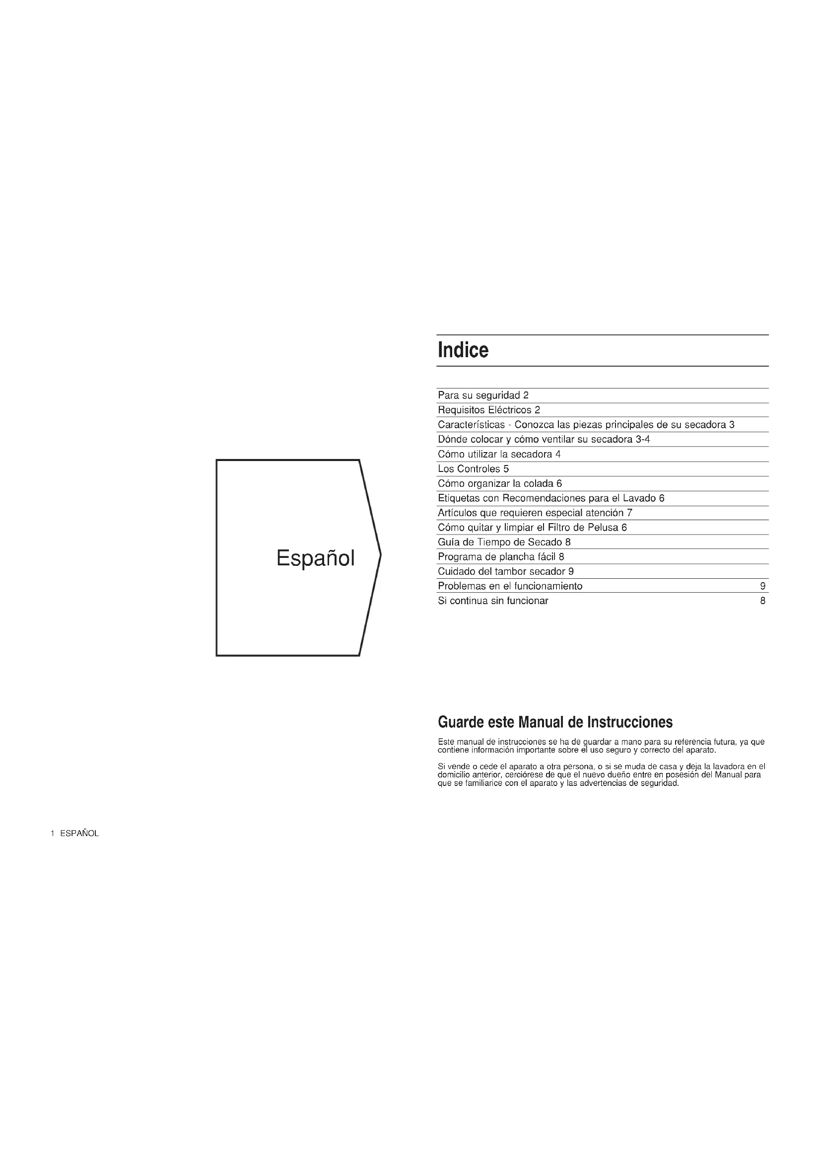 Para su seguridad 2 Requisitos Eléctricos 2 Características - Conozca las piezas principales de su secadora 3 Dónde colocar y cómo ventilar su secadora 3-4 Cómo utilizar la secadora 4 Los Controles 5 Cómo organizar la colada 6 Etiquetas con Recomendaciones para el Lavado 6 Artículos que requieren especial atención 7 Cómo quitar y limpiar el Filtro de Pelusa 6 Guía de Tiempo de Secado 8 Programa de plancha fácil 8 Cuidado del tambor secador 9 Problemas en el funcionamiento 9 Si continua sin funcionar 8 Indice Guarde este Manual de Instrucciones Este manual de instrucciones se ha de guardar a mano para su referencia futura, ya que contiene información importante sobre el uso seguro y correcto del aparato. Si vende o cede el aparato a otra persona, o si se muda de casa y deja la lavadora en el domicilio anterior, cerciórese de que el nuevo dueño entre en posesión del Manual para que se familiarice con el aparato y las advertencias de seguridad. EspañolPara su seguridad NUNCA ● Permita que los niños jueguen o interfieran en la secadora. NUNCA ● Permita que se obstruya la entrada de aire en la parte posterior de la secadora, así como la salida de aire o el tubo de ventilación. NUNCA ● Oriente la salida del tubo de ventilación hacia la toma de aire situada en la parte posterior de la máquina. NUNCA ● Permita que la secadora recicle el aire de escape. NUNCA ● Desenchufe la máquina cuando haya una colada caliente dentro del tambor. NUNCA ● Seque cuando el filtro no esté colocado en su posición correcta. NUNCA ● Sobrecargue la máquina (por encima de la cantidad recomenda- da), ni meta ropa empapada dentro del tambor. NUNCA ● Coloque la secadora sobre un suelo alfombrado cuando el pelo de la alfombra pueda impedir que pase el aire por la base de la secadora. NUNCA ● Permita que se acumule pelusa alrededor de la secadora. NUNCA ● Añada líquido o suavizante en la secadora; utilice suavizante líquido en el aclarado final de su lavado. NUNCA ● Utilice la secadora para uso comercial. Esta secadora ha sido diseñada tan solo para uso doméstico. NUNCA ● Seque tejidos acrílicos en la temperatura más alta. NUNCA ● Seque artículos que NO se hayan lavado bien anteriormente con agua y detergente, y estén bien aclarados y centrifugados. NUNCA ● Seque ropa que haya sido limpiada utilizando productos químicos. NUNCA ● Seque artículos contaminados con sustancias inflamables, tales como: gasolina, aceite, pintura, laca de pelo, cremas y grasas o aceite de cocina. NUNCA ● Seque: goma, goma espuma, plástico, plástico expansible, braguitas pañal o pañales interiores, polietileno o papel. Artículos grandes y abultados, como por ej. edredones o sacos de dormir. NUNCA ● Se suba encima de la secadora; no está diseñada para ello y podría resultar lesionado o bien dañar la lavadora. NUNCA ● Conecte y desconecte la electricidad con las manos mojadas. IMPORTANTE Su Secadora es fácil de utilizar. No obstante, para su propia seguridad y con el fin de obtener los mejores resultados, es importante que lea el manual completo de su secadora antes de utilizarla por primera vez. LOS NIÑOS PUEDEN METERSE DENTRO DE LA SECADORA O MANIPULARLA SI SE LES DEJA SOLOS. SIEMPRE QUE NO SE UTILICE LA MAQUINA: APAGUELA, DESENCHUFELA Y CIERRE LA PUERTA. IMPORTANTE Para su seguridad SIEMPRE ● Que no utilice la secadora: apáguela, desenchúfela y cierre la puerta. SIEMPRE ● Cumpla los requisitos eléctricos especificados. SIEMPRE ● Asegúrese de que la secadora se ha instalado correctamente y la ventilación sea la adecuada. (vea “Dónde colocar y ventilación de la secadora.”) SIEMPRE ● Utilice el tubo de ventilación con el fin de obtener los mejores resultados en el secado. SIEMPRE ● Finalice cada programa con el control de ajuste del ciclo en la posición frío. SIEMPRE ● Limpie el filtro. Es esencial que el filtro esté libre de pelusa en todo momento. SIEMPRE ● Observe las recomendaciones de secado de las prendas: Los artículos de lana en particular no pueden secarse en una secadora, a menos que su etiqueta indique que pueden lavarse en lavadora o bien muestren el símbolo , indicando que pueden secarse a máquina. De no estar seguro, no seque los artículos de lana en la secadora. A diferencia de otros tejidos, el mecanismo de encogimiento de la lana es irreversible; esto es, no puede volverse a estirar y coger su forma y tamaño anteriores. SIEMPRE ● Compre accesorios y piezas de repuesto originales. Requisitos Eléctricos VEASE LA PLACA DE DATOS PARA COMPROBAR LOS REQUI- SITOS DE VOLTAJE Y DE CORRIENTE. (Vea la ubicación en el diagrama.) La secadora ha de estar conectada a la red eléctrica con un enchufe que sea accesible una vez se haya instalado la secadora. Los cables coloreados en el cable de la red indican lo siguiente: