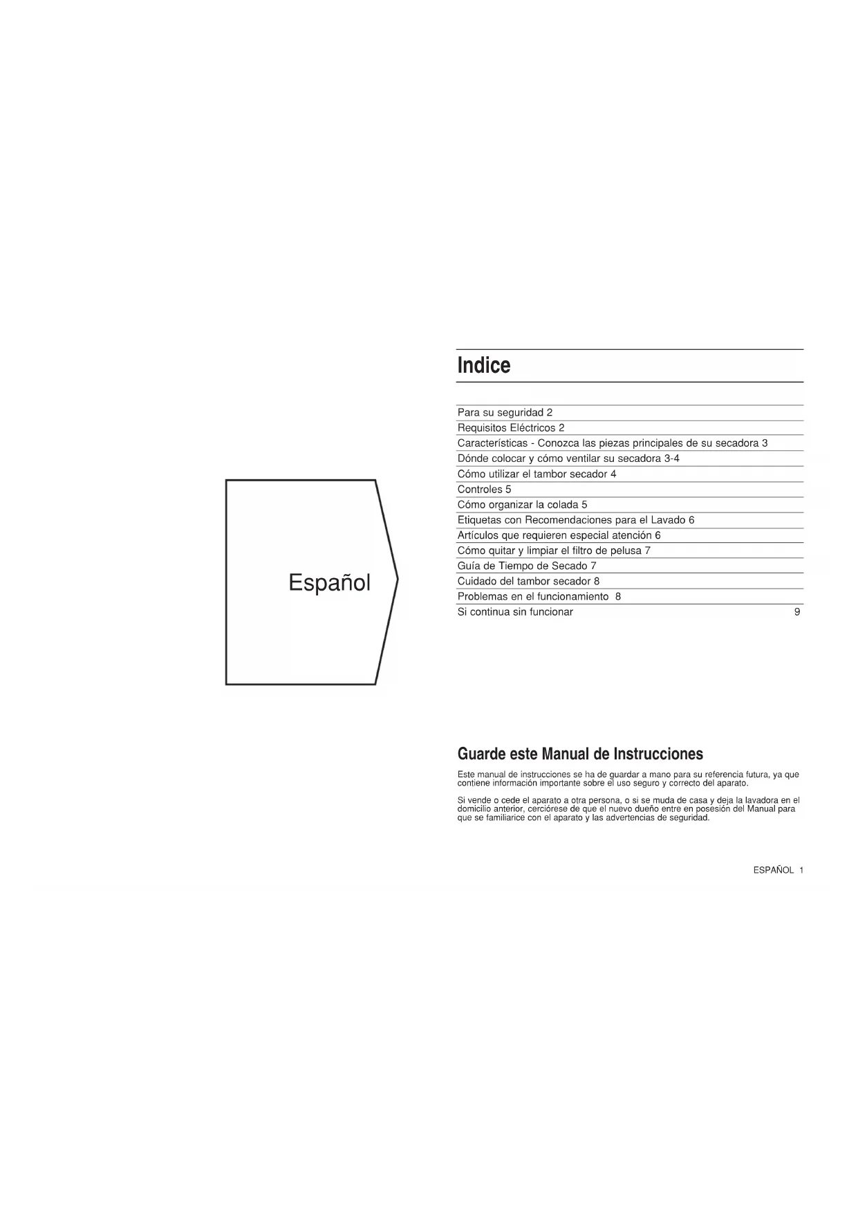 Assurez-vous de posséder tous ces renseignements lorsque vous appelez. N’oubliez pas que votre nouvel appareil est un équipement complexe. Les réparations « maison» ou celles réalisés par des personnes non qualifiées ou non formées peuvent constituer un danger, endommager l’appareil et peuvent annuler votre droit de bénéficier de la Garantie sur les pièces. Si vous avez un problème avec l’appareil, ne prendre aucun risque, appelez un technicien d’entretien. Nos pièces de rechange sont conçus exclusivement pour convenir à votre appareil. Ne pas les utiliser pour aucun autre usage, cela peut constituer un risque important. Pour minimiser le risque de blessures aux enfants, veuillez éliminer votre produit en toute securité. La porte et le couvercle doivent être enlevés et le câble du secteur doit être coupé près de l’appareil pour assurer que la fiche ne puisse pas être branchée dans une prise de courant. Cet appareil est conforme aux directives de la CEE suivantes : Equipement à bas voltage 72/23/EEC 93/68/EEC Compatibilité électromagnétique 89/336/EEC 92/31/EEC 93/68/EEC Contactez le Centre de servicesESPAÑOL 1 Para su seguridad 2 Requisitos Eléctricos 2 Características - Conozca las piezas principales de su secadora 3 Dónde colocar y cómo ventilar su secadora 3-4 Cómo utilizar el tambor secador 4 Controles 5 Cómo organizar la colada 5 Etiquetas con Recomendaciones para el Lavado 6 Artículos que requieren especial atención 6 Cómo quitar y limpiar el filtro de pelusa 7 Guía de Tiempo de Secado 7 Cuidado del tambor secador 8 Problemas en el funcionamiento 8 Si continua sin funcionar 9 Indice Guarde este Manual de Instrucciones Este manual de instrucciones se ha de guardar a mano para su referencia futura, ya que contiene información importante sobre el uso seguro y correcto del aparato. Si vende o cede el aparato a otra persona, o si se muda de casa y deja la lavadora en el domicilio anterior, cerciórese de que el nuevo dueño entre en posesión del Manual para que se familiarice con el aparato y las advertencias de seguridad. Español2 ESPAÑOL Para su seguridad NUNCA ● Permita que los niños jueguen o interfieran en la secadora. NUNCA ● Permita que se obstruya la entrada de aire en la parte posterior de la secadora, así como la salida de aire o el tubo de ventilación. NUNCA ● Oriente la salida del tubo de ventilación hacia la toma de aire situada en la parte posterior de la máquina. NUNCA ● Permita que la secadora recicle el aire de escape. NUNCA ● Desenchufe la máquina cuando haya una colada caliente dentro del tambor. NUNCA ● Seque cuando el filtro no esté colocado en su posición correcta. NUNCA ● Sobrecargue la máquina (por encima de la cantidad recomenda- da), ni meta ropa empapada dentro del tambor. NUNCA ● Coloque la secadora sobre un suelo alfombrado cuando el pelo de la alfombra pueda impedir que pase el aire por la base de la secadora. NUNCA ● Permita que se acumule pelusa alrededor de la secadora. NUNCA ● Añada líquido o suavizante en la secadora; utilice suavizante líquido en el aclarado final de su lavado. NUNCA ● Utilice la secadora para uso comercial. Esta secadora ha sido diseñada tan solo para uso doméstico. NUNCA ● Seque tejidos acrílicos en la temperatura más alta. NUNCA ● Seque artículos que NO se hayan lavado bien anteriormente con agua y detergente, y estén bien aclarados y centrifugados. NUNCA ● Seque ropa que haya sido limpiada utilizando productos químicos. NUNCA ● Seque artículos contaminados con sustancias inflamables, tales como: gasolina, aceite, pintura, laca de pelo, cremas y grasas o aceite de cocina. NUNCA ● Seque: goma, goma espuma, plástico, plástico expansible, braguitas pañal o pañales interiores, polietileno o papel. Artículos grandes y abultados, como por ej. edredones o sacos de dormir. NUNCA ● Se suba encima de la secadora; no está diseñada para ello y podría resultar lesionado o bien dañar la lavadora. NUNCA ● Conecte y desconecte la electricidad con las manos mojadas. IMPORTANTE Su Secadora es fácil de utilizar. No obstante, para su propia seguridad y con el fin de obtener los mejores resultados, es importante que lea el manual completo de su secadora antes de utilizarla por primera vez. LOS NIÑOS PUEDEN METERSE DENTRO DE LA SECADORA O MANIPU- LARLA SI SE LES DEJA SOLOS. SIEMPRE QUE NO SE UTILICE LA MAQUINA: APAGUELA, DES- ENCHUFELA Y CIERRE LA PUERTA. IMPORTANTE Para su seguridad SIEMPRE ● Que no utilice la secadora: apáguela, desenchúfela y cierre la puerta. SIEMPRE ● Cumpla los requisitos eléctricos especificados. SIEMPRE ● Asegúrese de que la secadora se ha instalado correctamente y la ventilación sea la adecuada. (vea “Dónde colocar y ventilación de la secadora.”) SIEMPRE ● Utilice el tubo de ventilación con el fin de obtener los mejores resultados en el secado. SIEMPRE ● Finalice cada programa con el control de ajuste del ciclo en la posición frío. SIEMPRE ● Limpie el filtro. Es esencial que el filtro esté libre de pelusa en todo momento. SIEMPRE ● Observe las recomendaciones de secado de las prendas: Los artículos de lana en particular no pueden secarse en una secadora, a menos que su etiqueta indique que pueden lavarse en lavadora o bien muestren el símbolo , indicando que pueden secarse a máquina. De no estar seguro, no seque los artículos de lana en la secadora. A diferencia de otros tejidos, el mecanismo de encogimiento de la lana es irreversible; esto es, no puede volverse a estirar y coger su forma y tamaño anteriores. SIEMPRE ● Compre accesorios y piezas de repuesto originales. Requisitos Eléctricos VEASE LA PLACA DE DATOS PARA COMPROBAR LOS REQUI- SITOS DE VOLTAJE Y DE CORRIENTE. (Vea la ubicación en el diagrama.) La secadora ha de estar conectada a la red eléctrica con un enchufe que sea accesible una vez se haya instalado la secadora. Los cables coloreados en el cable de la r