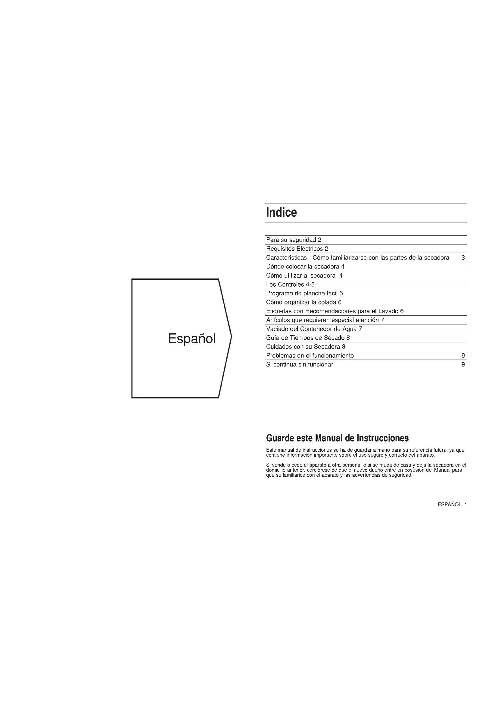 Gelieve ervoor te zorgen dat u alle informatie bij de hand heeft wan- neer u ons opbelt. Vergeet nooit dat uw nieuw apparaat een ingewikkelde machine is. ‘Doe-het-zelf’herstelwerk of onbevoegde of onervaren onder- houdsmonteurs kunnen u in gevaar brengen, kunnen het apparaat beschadigen wat tot gevolg kan hebben dat uw Onderdelengarantie niet geldig is. Als u problemen heeft met uw apparaat neem dan geen risico’s. Neem contact op met onze Onderhoudsmonteur. Onze Onderdelen werden speciaal ontworpen voor uw apparaat. Gebruik ze voor niets anders want u zou een brandgevaar kunnen veroorzaken. Om ongevallen met kinderen te minimaliseren, zorg ervoor dat u uw produkt veilig verwijdert. De deur en het dekblad moeten verwijderd worden en de elektrische snoeren moeten afgesneden worden tutta questa frase va eliminata. Alle onderdelen moeten vervolgens veilig verwijderd worden. Dit apparaat voldoen aan de volgende EEC Richtlijnen: Laag Voltage Uitrusting 72/23/EEC 93/68/EEC Elektromagnetische Compatibiliteit 89/336/EEC 92/31/EEC 93/68/EEC Neem contact op met het OnderhoudskantoorEspañol ESPAÑOL 1 Para su seguridad 2 Requisitos Eléctricos 2 Características - Cómo familiarizarse con las partes de la secadora 3 Dónde colocar la secadora 4 Cómo utilizar al secadora 4 Los Controles 4-5 Programa de plancha fácil 5 Cómo organizar la colada 6 Etiquetas con Recomendaciones para el Lavado 6 Artículos que requieren especial atención 7 Vaciado del Contenedor de Agua 7 Guía de Tiempos de Secado 8 Cuidados con su Secadora 8 Problemas en el funcionamiento 9 Si continua sin funcionar 9 Indice Guarde este Manual de Instrucciones Este manual de instrucciones se ha de guardar a mano para su referencia futura, ya que contiene información importante sobre el uso seguro y correcto del aparato. Si vende o cede el aparato a otra persona, o si se muda de casa y deja la secadora en el domicilio anterior, cerciórese de que el nuevo dueño entre en posesión del Manual para que se familiarice con el aparato y las advertencias de seguridad.2 ESPAÑOL Para su seguridad NUNCA ● Permita que los niños jueguen o interfieran en la secadora. NUNCA ● Permita que se obstruya la entrada de aire en la parte delantera de la secadora o la salida de aire en la parte posterior. NUNCA ● Desenchufe la máquina cuando haya una colada caliente dentro del tambor. NUNCA ● Seque cuando el filtro, el contenedor del agua o el condensador no estén en su posición correcta. NUNCA ● Sobrecarge la máquina (por encima de la cantidad recomendada), ni meta ropa empapada dentro del tambor. NUNCA ● Permita que se acumule pelusa alrededor de la secadora. NUNCA ● Añada suavizante líquido a la secadora; utilice suavizante líquido en el último ciclo de aclarado de la lavadora. NUNCA ● Utilice la secadora para uso comercial. Esta secadora ha sido diseñada tan solo para uso doméstico. NUNCA ● Seque tejidos acrílicos o sintéticos en la temperatura más alta. NUNCA ● Seque artículos que NO se hayan lavado bien anteriormente con agua y detergente, y estén bien aclarados y centrifugados. NUNCA ● Seque ropa que haya sido limpiada utilizando productos químicos. NUNCA ● Seque artículos contaminados con sustancias inflamables, tales como: gasolina, aceite, pintura, laca de pelo, cremas y grasas o aceite de cocina. NUNCA ● Seque: goma, goma espuma, plástico, plástico expansible, braguitas pañal o pañales interiores, polietileno o papel. Artículos grandes y abultados, como por ej. edredones o sacos de dormir. NUNCA ● Se suba encima de la secadora; no está diseñada para ello y podría resultar lesionado o bien dañar la lavadora. NUNCA ● Conecte y desconecte la electricidad con las manos mojadas. IMPORTANTE Su Secadora es fácil de utilizar. No obstante, para su propia seguridad y con el fin de obtener los mejores resultados, es importante que lea el manual completo de su secadora antes de utilizarla por primera vez. LOS NIÑOS PUEDEN METERSE DENTRO DE LA SECADORA O MANIPULAR- LA SI SE LES DEJA SOLOS. SIEMPRE QUE NO SE UTILICE LA MAQUINA: APAGUELA, DESENCHUFELA Y CIERRE LA PUERTA. IMPORTANTE Para su seguridad SIEMPRE ● Vacíe el contenedor del agua después de CADA ciclo de secado. SIEMPRE ● Limpie el filtro. Es esencial que el filtro no contenga pelusa en todo momento. SIEMPRE ● Cerciorar que el condensador esté libre de pelusas, se recomienda una limpieza rutinaria. SIEMPRE ● Que no utilice la secadora: apáguela, desenchúfela y cierre la puerta. SIEMPRE ● Cumpla los requisitos eléctricos especificados. SIEMPRE ● Asegúrese de que la secadora se ha instalado correctamente y la ventilación sea la adecuada. (vea, ‘Dónde colocar la secadora.’) SIEMPRE ● Finalice cada programa con el control de ajuste del ciclo en la posición frío. SIEMPRE ● Observe las recomendaciones de secado de las prendas: Los artículos de lana en particular no pueden secarse en una secadora, a menos que su etiqueta indique que pueden lavarse en lavadora o bien muestren el símbolo indicando que pueden secarse a máquina. De no estar seguro, no seque los artículos de lana en la secadora. A diferencia de otros tejidos, el proceso de encogimiento de la lana es irreversible; esto es, no puede volverse a estirar y coger su forma y tamaño anteriores. SIEMPRE ● Compre accesorios y piezas de repuesto originales. Requisitos Eléctricos VEASE LA PLACA DE DATOS PARA COMPROBAR LOS REQUISITOS DE VOLTAJE Y DE CORRIENTE. (vea la ubicación en el diagrama.) La secadora ha de estar conectada a la red eléctrica con un enchufe que sea accesible una vez se haya instalado la secadora. Los cables coloreados en el cable de la red indican lo siguiente: