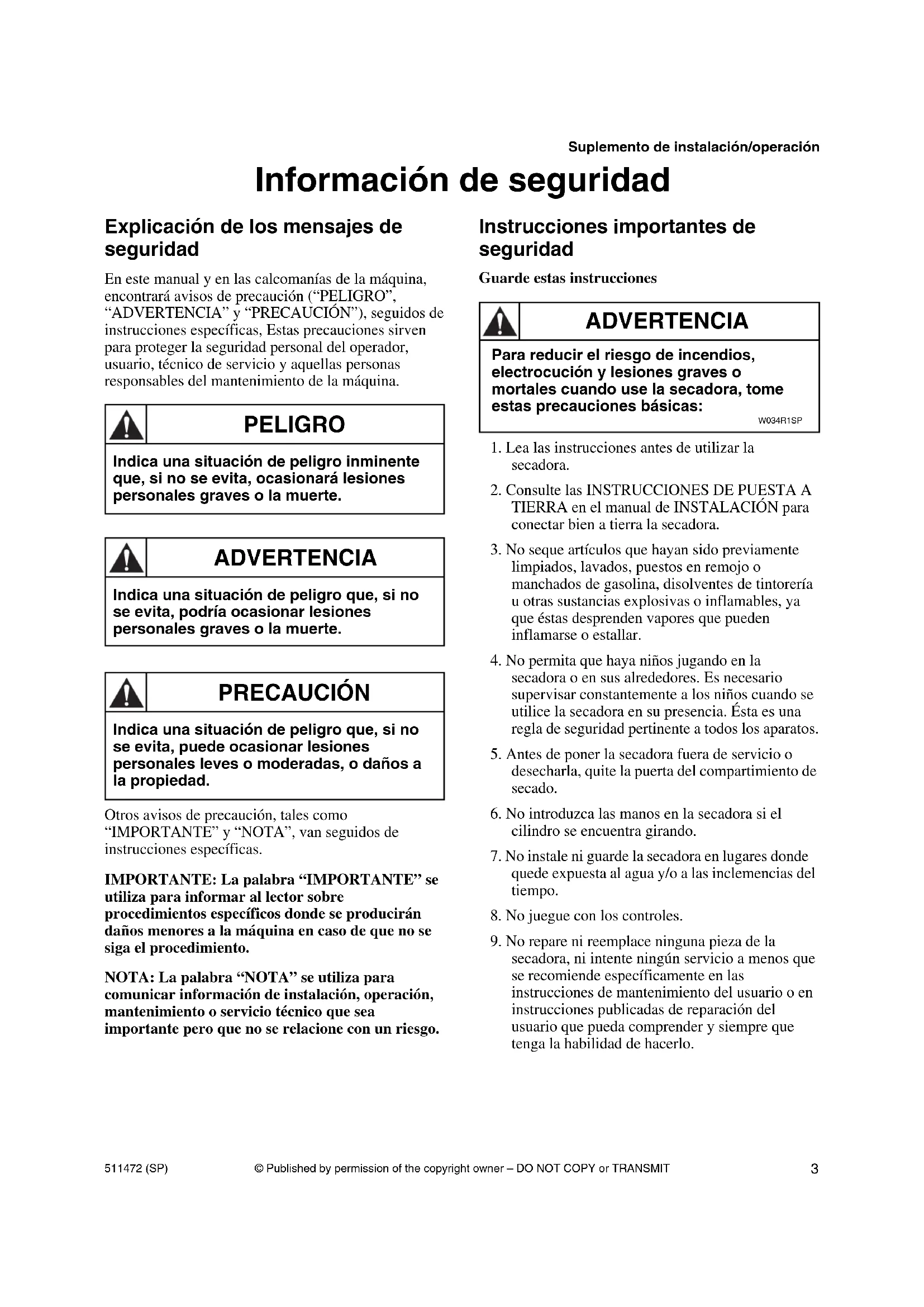 secadora, ni intente ningún servicio a menos que se recomiende específicamente en las instrucciones de mantenimiento del usuario o en instrucciones publicadas de reparación del usuario que pueda comprender y siempre que tenga la habilidad de hacerlo. Indica una situación de peligro inminente que, si no se evita, ocasionará lesiones personales graves o la muerte. PELIGRO Indica una situación de peligro que, si no se evita, podría ocasionar lesiones personales graves o la muerte. ADVERTENCIA Indica una situación de peligro que, si no se evita, puede ocasionar lesiones personales leves o moderadas, o daños a la propiedad. PRECAUCIÓN Para reducir el riesgo de incendios, electrocución y lesiones graves o mortales cuando use la secadora, tome estas precauciones básicas: W034R1SP ADVERTENCIA© Published by permission of the copyright owner – DO NOT COPY or TRANSMIT Suplemento de instalación/operación 511472 (SP)