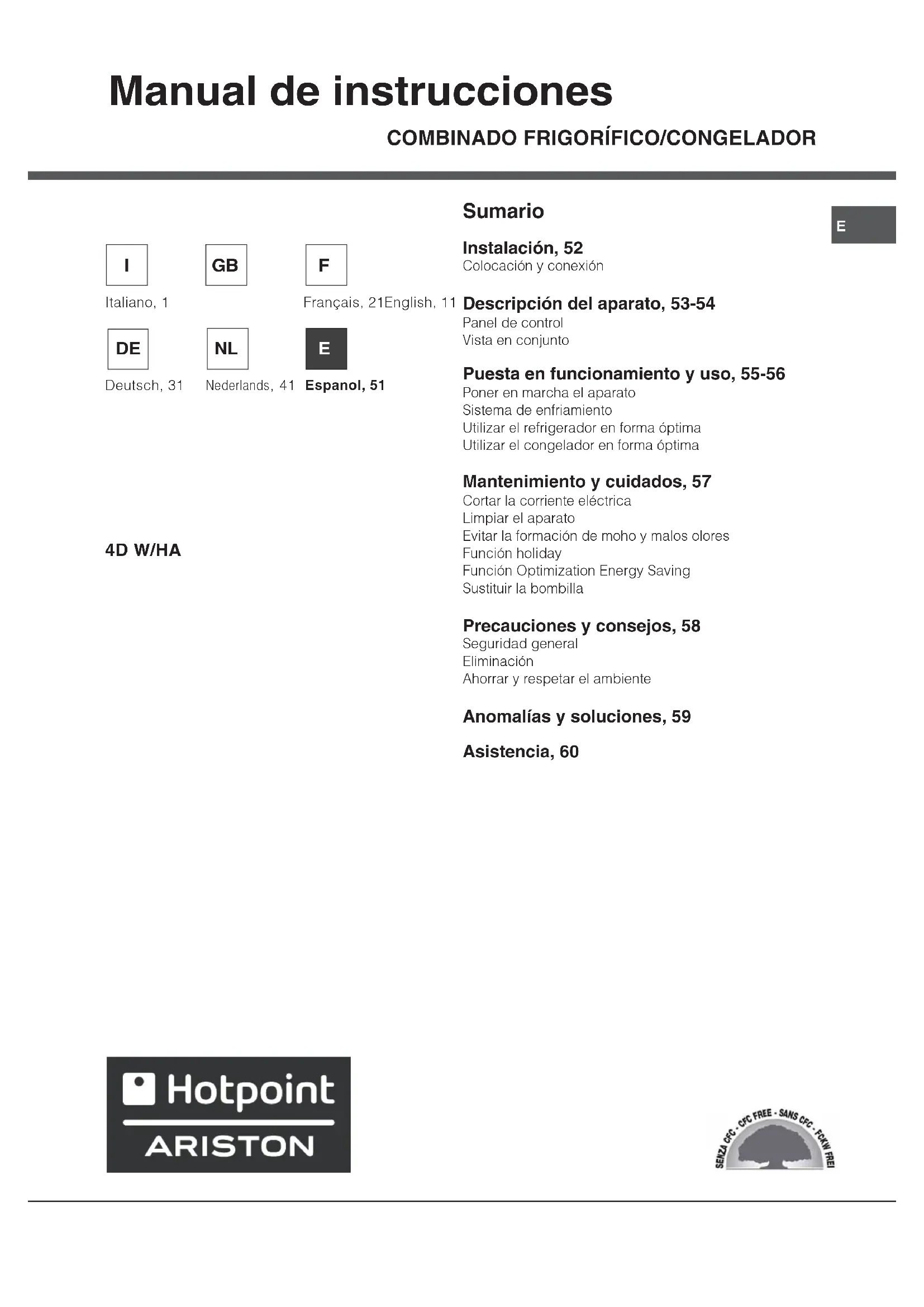 Manual de instrucciones Sumario Instalación, 52 Colocación y conexión Descripción del aparato, 53-54 Panel de control Vista en conjunto Puesta en funcionamiento y uso, 55-56 Poner en marcha el aparato Sistema de enfriamiento Utilizar el refrigerador en forma óptima Utilizar el congelador en forma óptima Mantenimiento y cuidados, 57 Cortar la corriente eléctrica Limpiar el aparato Evitar la formación de moho y malos olores Función holiday Función Optimization Energy Saving Sustituir la bombilla Precauciones y consejos, 58 Seguridad general Eliminación Ahorrar y respetar el ambiente Anomalías y soluciones, 59 Asistencia, 60 Italiano, 1