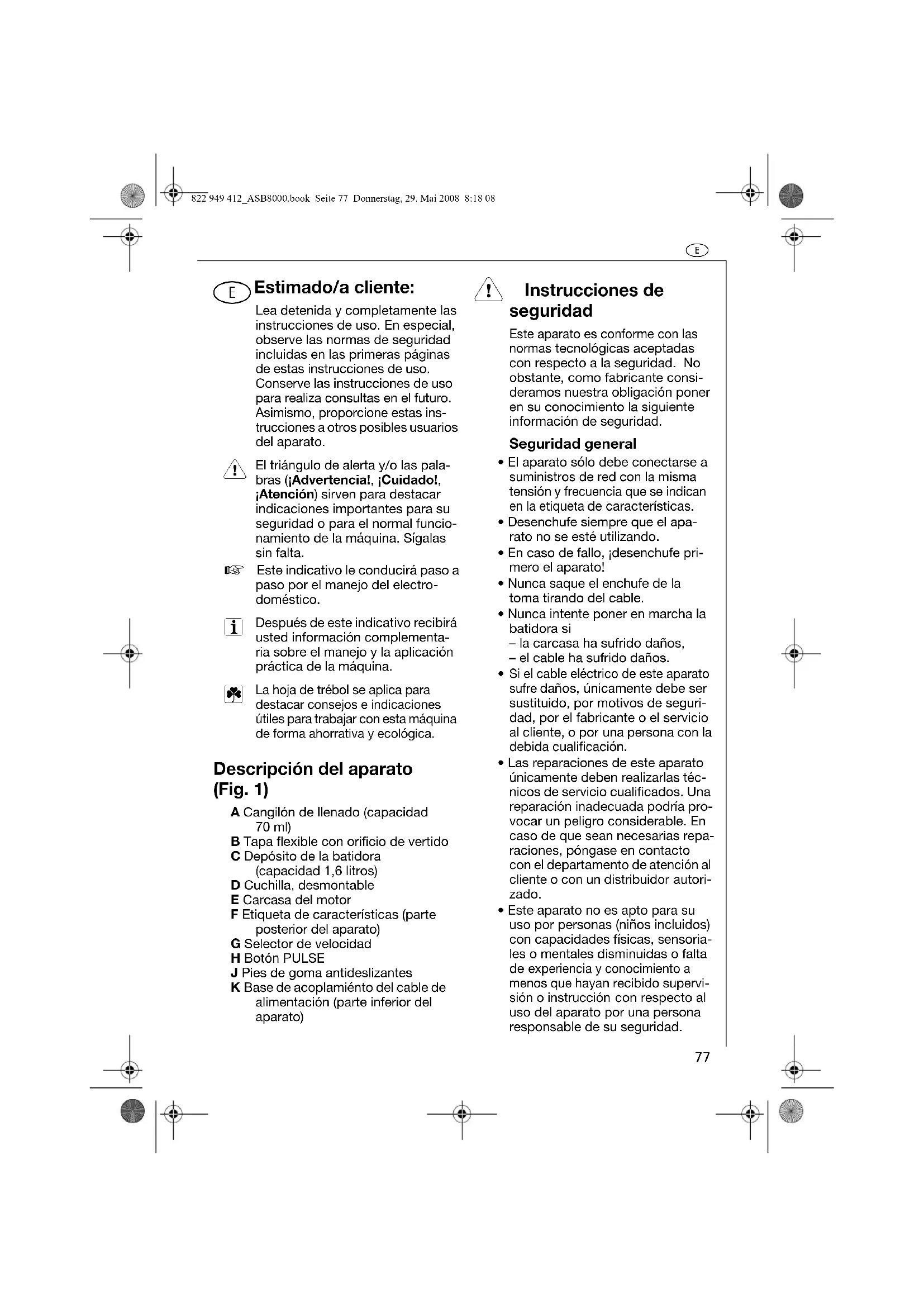 Estimado/a cliente: Lea detenida y completamente las instrucciones de uso. En especial, observe las normas de seguridad incluidas en las primeras páginas de estas instrucciones de uso. Conserve las instrucciones de uso para realiza consultas en el futuro. Asimismo, proporcione estas ins-trucciones a otros posibles usuarios del aparato. El triángulo de alerta y/o las pala- bras (¡Advertencia!, ¡Cuidado!, ¡Atención) sirven para destacar indicaciones importantes para su seguridad o para el normal funcio-namiento de la máquina. Sígalas sin falta.0 Este indicativo le conducirá paso a paso por el manejo del electro-doméstico. Después de este indicativo recibirá usted información complementa-ria sobre el manejo y la aplicación práctica de la máquina. La hoja de trébol se aplica para destacar consejos e indicaciones útiles para trabajar con esta máquina de forma ahorrativa y ecológica. Descripción del aparato (Fig. 1) A Cangilón de llenado (capacidad 70 ml)B Tapa flexible con orificio de vertidoC Depósito de la batidora (capacidad 1,6 litros)D Cuchilla, desmontableE Carcasa del motorF Etiqueta de características (parte posterior del aparato)G Selector de velocidadH Botón PULSEJ Pies de goma antideslizantesK Base de acoplamiénto del cable de alimentación (parte inferior del aparato) 1 Instrucciones de seguridad Este aparato es conforme con las normas tecnológicas aceptadas con respecto a la seguridad. No obstante, como fabricante consi-deramos nuestra obligación poner en su conocimiento la siguiente información de seguridad. Seguridad general• El aparato sólo debe conectarse a suministros de red con la misma tensión y frecuencia que se indican en la etiqueta de características.• Desenchufe siempre que el apa-rato no se esté utilizando.• En caso de fallo, ¡desenchufe pri-mero el aparato! • Nunca saque el enchufe de la toma tirando del cable.• Nunca intente poner en marcha la batidora si– la carcasa ha sufrido daños,– el cable ha sufrido daños. Si el cable eléctrico de este aparato sufre daños, únicamente debe ser sustituido, por motivos de seguri-dad, por el fabricante o el servicio al cliente, o por una persona con la debida cualificación.• Las reparaciones de este aparato únicamente deben realizarlas téc-nicos de servicio cualificados. Una reparación inadecuada podría pro-vocar un peligro considerable. En caso de que sean necesarias repa-raciones, póngase en contacto con el departamento de atención al cliente o con un distribuidor autori-zado.• Este aparato no es apto para su uso por personas (niños incluidos) con capacidades físicas, sensoria-les o mentales disminuidas o falta experiencia y conocimiento a menos que hayan recibido supervi-sión o instrucción con respecto al uso del aparato por una persona responsable de su seguridad.822 949 412_ASB8000.book Seite 77 Donnerstag, 29. Mai 2008 8:18 08e