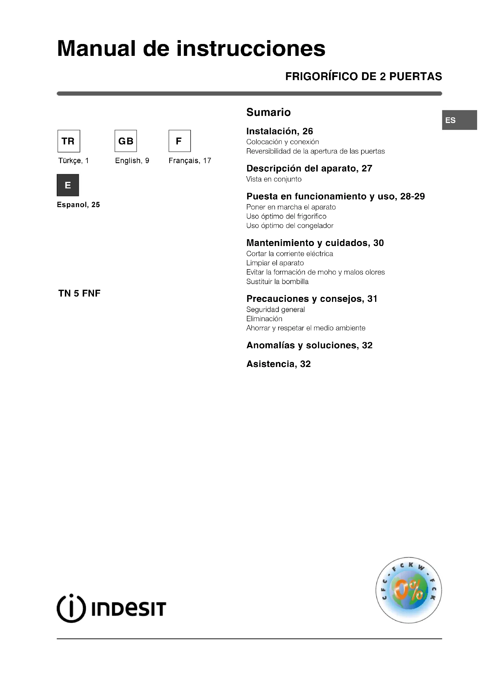 Sumario Instalación, 26 Colocación y conexión Reversibilidad de la apertura de las puertas Descripción del aparato, 27 Vista en conjunto Puesta en funcionamiento y uso, 28-29 Poner en marcha el aparato Uso óptimo del frigorífico Uso óptimo del congelador Mantenimiento y cuidados, 30 Cortar la corriente eléctrica Limpiar el aparato Evitar la formación de moho y malos olores Sustituir la bombilla Precauciones y consejos, 31 Seguridad general Eliminación Ahorrar y respetar el medio ambiente Anomalías y soluciones, 32 Asistencia, 32 Manual de instrucciones TN 5 FNF English, 9