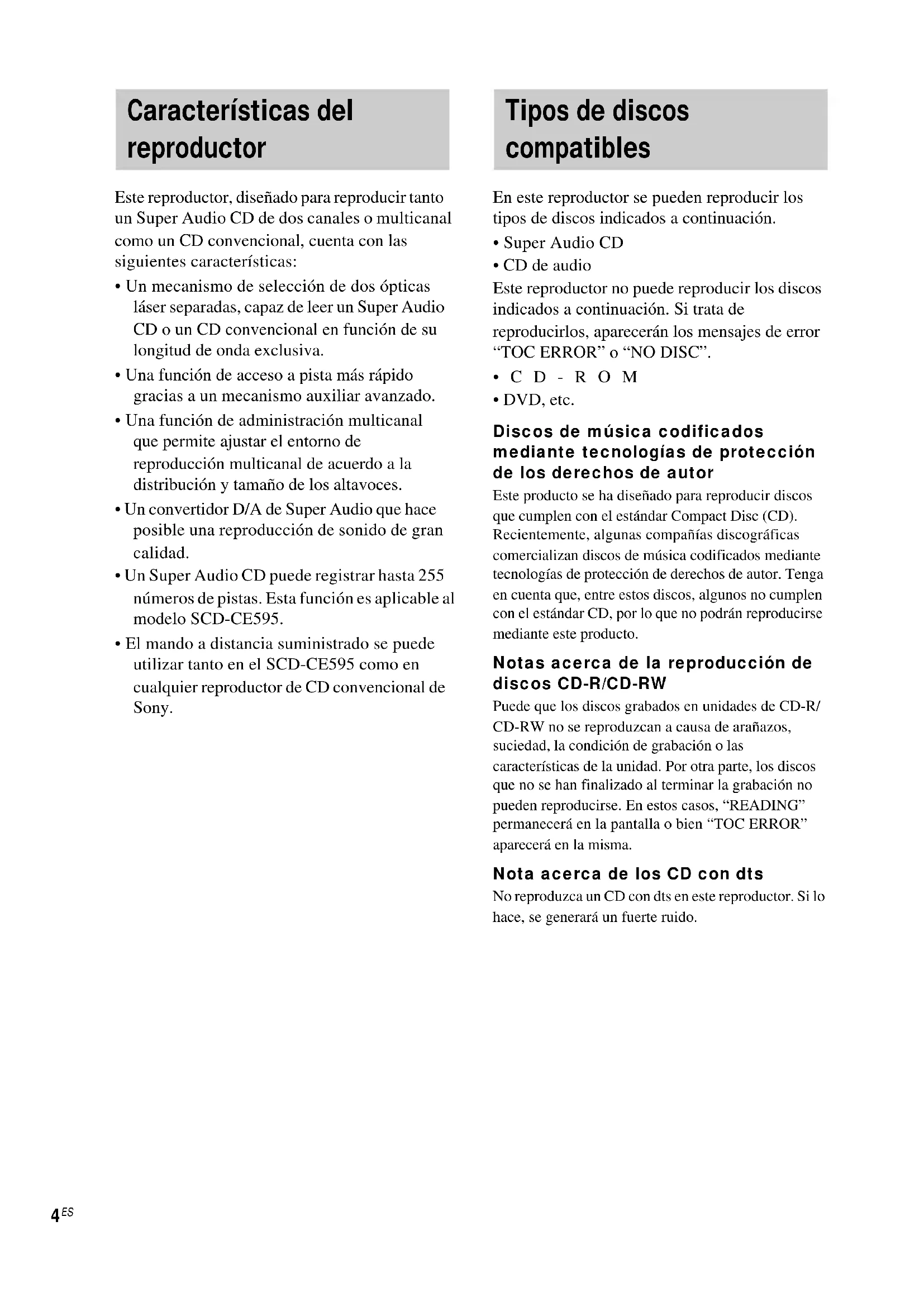 Este reproductor, diseñado para reproducir tanto un Super Audio CD de dos canales o multicanal como un CD convencional, cuenta con las siguientes características: