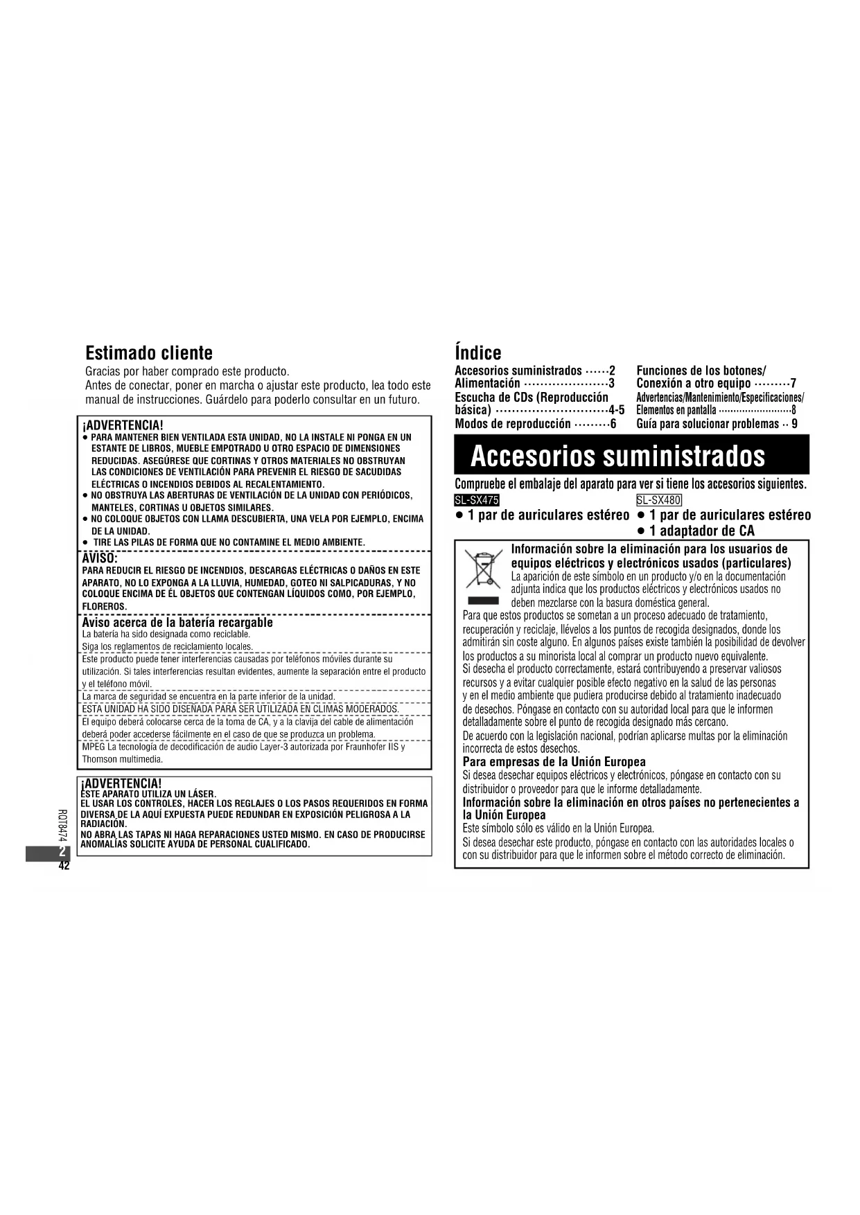 Compruebe el embalaje del aparato para ver si tiene los accesorios siguientes. SL-SX475 1 par de auriculares estéreo SL-SX480 1 par de auriculares estéreo 1 adaptador de CA ¡ADVERTENCIA! PARA MANTENER BIEN VENTILADA ESTA UNIDAD, NO LA INSTALE NI PONGA EN UN ESTANTE DE LIBROS, MUEBLE EMPOTRADO U OTRO ESPACIO DE DIMENSIONES REDUCIDAS. ASEGÚRESE QUE CORTINAS Y OTROS MATERIALES NO OBSTRUYAN LAS CONDICIONES DE VENTILACIÓN PARA PREVENIR EL RIESGO DE SACUDIDAS ELÉCTRICAS O INCENDIOS DEBIDOS AL RECALENTAMIENTO. NO OBSTRUYA LAS ABERTURAS DE VENTILACIÓN DE LA UNIDAD CON PERIÓDICOS, MANTELES, CORTINAS U OBJETOS SIMILARES. NO COLOQUE OBJETOS CON LLAMA DESCUBIERTA, UNA VELA POR EJEMPLO, ENCIMA DE LA UNIDAD.TIRE LAS PILAS DE FORMA QUE NO CONTAMINE EL MEDIO AMBIENTE. AVISO: PARA REDUCIR EL RIESGO DE INCENDIOS, DESCARGAS ELÉCTRICAS O DAÑOS EN ESTE APARATO, NO LO EXPONGA A LA LLUVIA, HUMEDAD, GOTEO NI SALPICADURAS, Y NO COLOQUE ENCIMA DE ÉL OBJETOS QUE CONTENGAN LÍQUIDOS COMO, POR EJEMPLO, FLOREROS. Aviso acerca de la batería recargable La batería ha sido designada como reciclable.Siga los reglamentos de reciclamiento locales.Este producto puede tener interferencias causadas por teléfonos móviles durante su utilización. Si tales interferencias resultan evidentes, aumente la separación entre el producto y el teléfono móvil.La marca de seguridad se encuentra en la parte inferior de la unidad.ESTA UNIDAD HA SIDO DISEÑADA PARA SER UTILIZADA EN CLIMAS MODERADOS.El equipo deberá colocarse cerca de la toma de CA, y a la clavija del cable de alimentación deberá poder accederse fácilmente en el caso de que se produzca un problema.MPEG La tecnología de decodificación de audio Layer-3 autorizada por Fraunhofer IIS y Thomson multimedia. ¡ADVERTENCIA! ESTE APARATO UTILIZA UN LÁSER.EL USAR LOS CONTROLES, HACER LOS REGLAJES O LOS PASOS REQUERIDOS EN FORMA DIVERSA DE LA AQUÍ EXPUESTA PUEDE REDUNDAR EN EXPOSICIÓN PELIGROSA A LA RADIACIÓN.NO ABRA LAS TAPAS NI HAGA REPARACIONES USTED MISMO. EN CASO DE PRODUCIRSE ANOMALÍAS SOLICITE AYUDA DE PERSONAL CUALIFICADO. Información sobre la eliminación para los usuarios de equipos eléctricos y electrónicos usados (particulares) La aparición de este símbolo en un producto y/o en la documentación adjunta indica que los productos eléctricos y electrónicos usados no deben mezclarse con la basura doméstica general. Para que estos productos se sometan a un proceso adecuado de tratamiento, recuperación y reciclaje, llévelos a los puntos de recogida designados, donde los admitirán sin coste alguno. En algunos países existe también la posibilidad de devolver los productos a su minorista local al comprar un producto nuevo equivalente. Si desecha el producto correctamente, estará contribuyendo a preservar valiosos recursos y a evitar cualquier posible efecto negativo en la salud de las personas y en el medio ambiente que pudiera producirse debido al tratamiento inadecuado de desechos. Póngase en contacto con su autoridad local para que le informen detalladamente sobre el punto de recogida designado más cercano. De acuerdo con la legislación nacional, podrían aplicarse multas por la eliminación incorrecta de estos desechos. Para empresas de la Unión Europea Si desea desechar equipos eléctricos y electrónicos, póngase en contacto con su distribuidor o proveedor para que le informe detalladamente. Información sobre la eliminación en otros países no pertenecientes a la Unión Europea Este símbolo sólo es válido en la Unión Europea. Si desea desechar este producto, póngase en contacto con las autoridades locales o con su distribuidor para que le informen sobre el método correcto de eliminación.