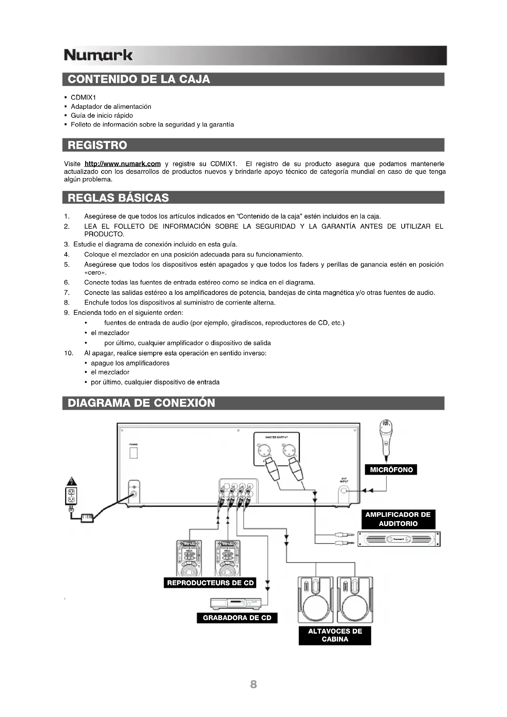 CDMIX1 Adaptador de alimentación Guía de inicio rápido Folleto de información sobre la seguridad y la garantía REGISTRO Visite http://www.numark.com y registre su CDMIX1. El registro de su producto asegura que podamos mantenerle actualizado con los desarrollos de productos nuevos y brindarle apoyo técnico de categoría mundial en caso de que tenga algún problema.