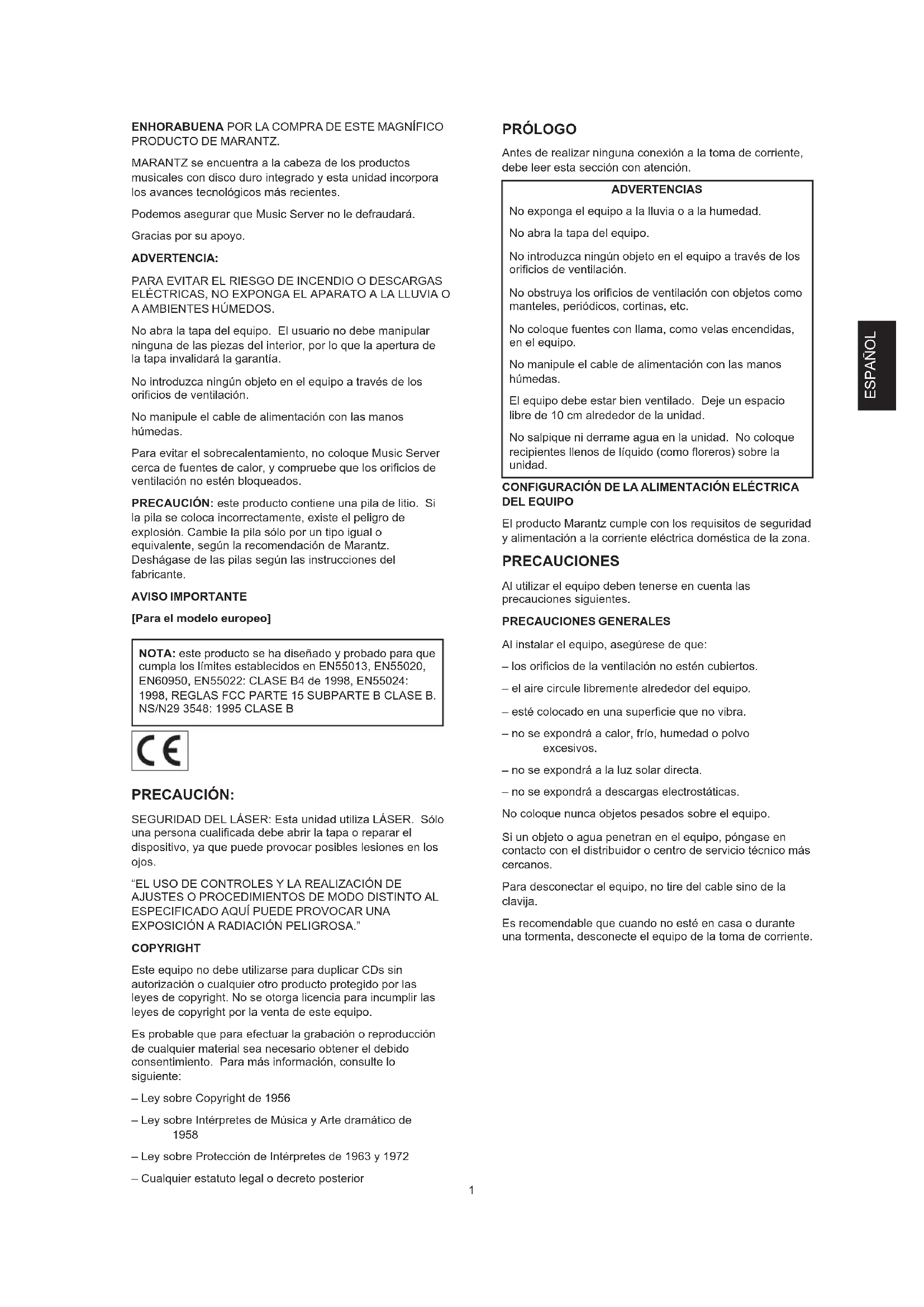 – Ley sobre Protección de Intérpretes de 1963 y 1972 – Cualquier estatuto legal o decreto posterior PRÓLOGO Antes de realizar ninguna conexión a la toma de corriente, debe leer esta sección con atención. ADVERTENCIAS No exponga el equipo a la lluvia o a la humedad. No abra la tapa del equipo. No introduzca ningún objeto en el equipo a través de los orificios de ventilación. No obstruya los orificios de ventilación con objetos como manteles, periódicos, cortinas, etc. No coloque fuentes con llama, como velas encendidas, en el equipo. No manipule el cable de alimentación con las manos húmedas. El equipo debe estar bien ventilado. Deje un espacio libre de 10 cm alrededor de la unidad. No salpique ni derrame agua en la unidad. No coloque recipientes llenos de líquido (como floreros) sobre la unidad. CONFIGURACIÓN DE LA ALIMENTACIÓN ELÉCTRICA DEL EQUIPO El producto Marantz cumple con los requisitos de seguridad y alimentación a la corriente eléctrica doméstica de la zona. PRECAUCIONES Al utilizar el equipo deben tenerse en cuenta las precauciones siguientes. PRECAUCIONES GENERALES Al instalar el equipo, asegúrese de que: – los orificios de la ventilación no estén cubiertos. – el aire circule libremente alrededor del equipo. – esté colocado en una superficie que no vibra. – no se expondrá a calor, frío, humedad o polvo excesivos. – no se expondrá a la luz solar directa. – no se expondrá a descargas electrostáticas. No coloque nunca objetos pesados sobre el equipo. Si un objeto o agua penetran en el equipo, póngase en contacto con el distribuidor o centro de servicio técnico más cercanos. Para desconectar el equipo, no tire del cable sino de la clavija. Es recomendable que cuando no esté en casa o durante una tormenta, desconecte el equipo de la toma de corriente.2 ESPAÑOL DISCOS COMPACTOS El lado brillante irisado es la parte frontal del disco y el lado en que se imprime la etiqueta es la parte posterior. A diferencia de las platinas convencionales que reproducen discos analógicos, el modelo DH9500 de Music Server lee la información grabada en el disco desde abajo, sin que se produzca contacto, utilizando un haz de luz láser. De esta manera, la calidad de un disco compacto no se degradará como los discos analógicos convencionales. Manipule los discos con cuidado para no dañar o rayar el lado frontal. Para proteger el disco, evite su colocación en los sitios siguientes: – Expuesto a luz solar directa o cerca de una fuente de calor, como una estufa. – En un lugar húmedo o sucio. – En sitios en los que pudiera estar expuesto a la lluvia, como cerca de una ventana. Mantenga siempre limpia la superficie del disco. En el lado frontal del disco puede haber hasta seis billones de unidades de datos grabados. Cuando limpie la superficie del disco, utilice un limpiador especial para discos compactos. No utilice un limpiador de discos convencional para discos analógicos, ya que puede afectar negativamente a la superficie del disco. Guarde los discos adecuadamente en sus respectivas fundas. No pegue un trozo de papel o un adhesivo en el lado de la etiqueta del disco. Si un disco tiene un trozo de cinta adhesiva de plástico o una etiqueta de CD con pegamento que sobresale del borde o contiene rastros de dicho objeto, no lo reproduzca. Si lo introduce en Music Server puede producir daños en el equipo. Incluso puede que sea imposible sacar el disco. No utilice discos con formas especiales. No utilice discos con formas de corazón u octogonal. Puede que el sistema deje de funcionar. Discos con codificación DTS. Precaución: al reproducir CDs con codificación DTS se oirá un ruido excesivo en lo conectores de salida analógica de MusicServer. Para evitar posibles daños al sistema de audio, asegúrese de que se han realizado las conexiones correctas al sistema de amplificación para la reproducción de este tipo de discos. PRECAUCIÓN Al deshacerse de las pilas usadas, siga las regulaciones gubernamentales o medioambientales o las normas de instrucción pública medioambiental que se apliquen en su país o región.
