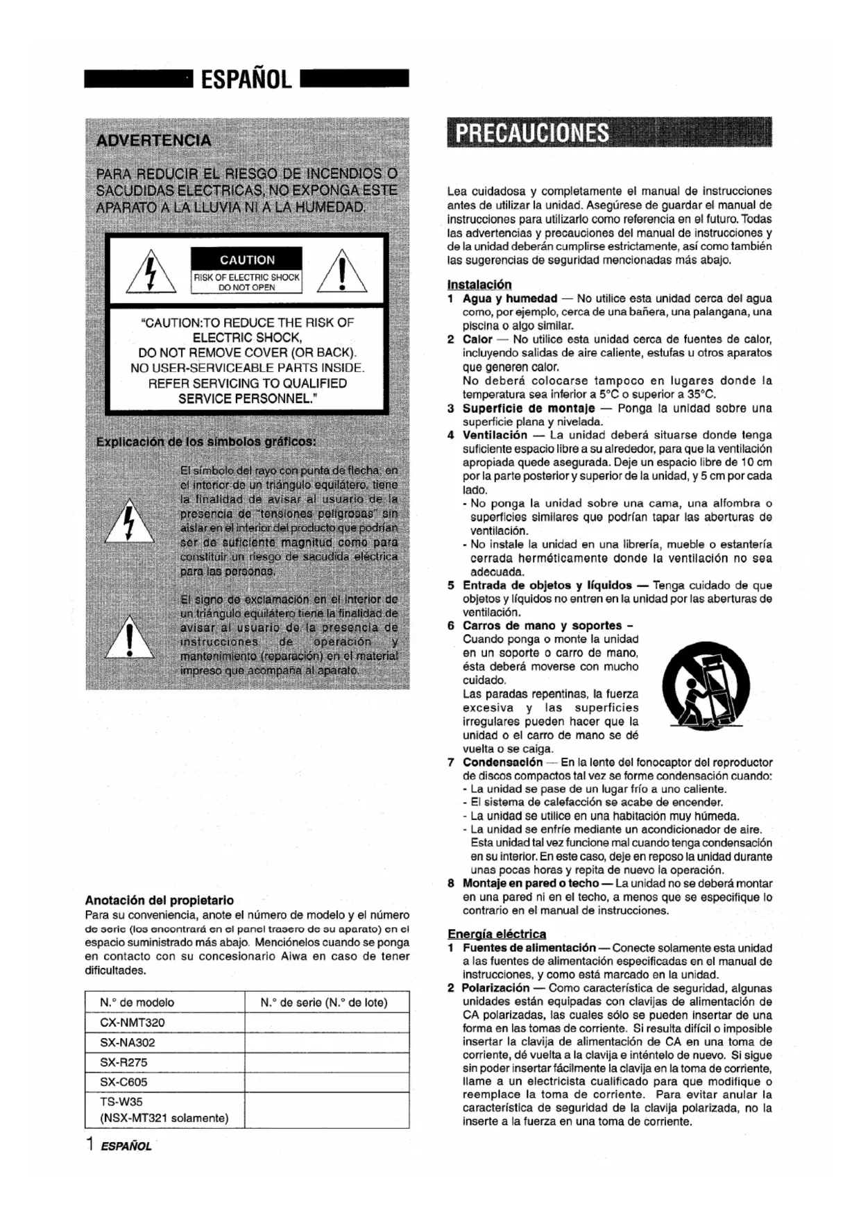 SERVICE PERSONNEL.” Anotacion del propietario Para su conveniencia, anote el ntimero de modelo y el numero de serie (Ios encontrara en el panel trasero de su aparato) en el espacio suministrado mas abajo. Mencionelos cuando se ponga en contacto con su concesionario Aiwa en caso de tener dificultades. [ N.” de modelo ] N.” de serie (N.” de Iote) I CX-NMT320 SX-NA302 I SX-R275
