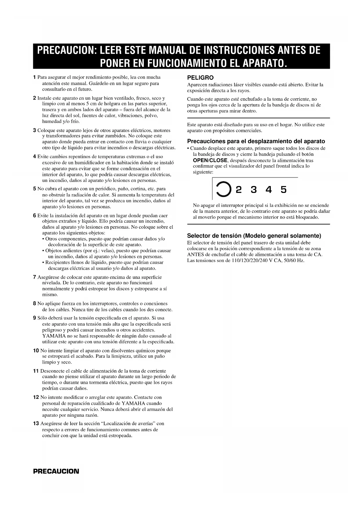 - Recipientes llenos de líquido, puesto que podrían causar descargas eléctricas al usuario y/o daños al aparato. 7 Asegúrese de colocar este aparato encima de una superficie nivelada. De lo contrario, este aparato no funcionará normalmente y podrá estropear los discos y estropearse a sí mismo. 8 No aplique fuerza en los interruptores, controles o conexiones de los cables. Nunca tire de los cables cuando los des conecte. 9 Sólo deberá usar la tensión especificada en el aparato. Si usa este aparato con una tensión más alta que la especificada será peligroso y podrá causar incendios u otros accidentes. YAMAHA no se hará responsable de ningún daño causado al utilizar este aparato con una tensión diferente a la especificada. 10 No intente limpiar el aparato con disolventes químicos porque se estropeará el acabado. Para la limipieza, utilice un paño limpio y seco. 11 Desconecte el cable de alimentación de la toma de corriente cuando no piense utilizar el aparato durante un largo periodo de tiempo, o durante una tormenta eléctrica, puesto que los rayos podrían causar daños. 12 No intente modificar o arreglar este aparato. Contacte con personal de reparación cualificado de YAMAHA cuando necesite cualquier servicio. Nunca deberá abrir el armazón del aparato por ninguna razón. 13 Asegúrese de leer la sección “Localización de averías” con respecto a errores de funcionamiento comunes antes de concluir con que la unidad está estropeada. PELIGRO Aparecen radiaciones láser visibles cuando está abierto. Evitar la exposición directa a los rayos. Cuando este aparato esté enchufado a la toma de corriente, no ponga los ojos cerca de la apertura de la bandeja de discos ni de otras aperturas para mirar dentro. Este aparato está diseñado para su uso en el hogar. No utilice este aparato con propósitos comerciales. Precauciones para el desplazamiento del aparato