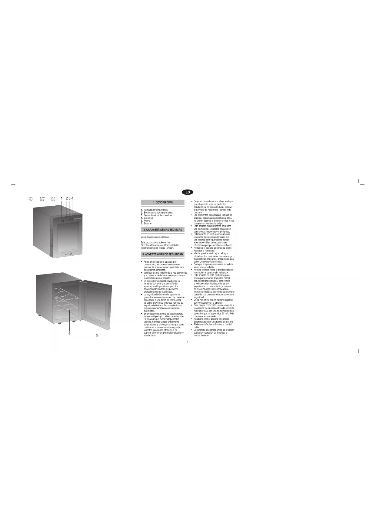 la temperatura seleccionada, abra la puerta (5) y coloque las botellas de vino en temperatura ambiente sobre los estantes (6). Las botellas alcanzarán la temperatura seleccionada aproximadamente en una hora. La vinoteca fija de forma automática un ciclo de encendido y apagado para mantener constantemente la temperatura seleccionada. Pulse el botón de luz (4) para encender la luz interior y ver lo que hay dentro de la vinoteca. Para apagar la luz, pulse de nuevo el mismo botón. Importante: Cierre bien la puerta (5) y no la abra con demasiada frecuencia ni durante un periodo largo de tiempo, el vino no alcanzaría la temperatura seleccionada.3 como advertencia de la no utilización de contenedores tradicionales para su eliminación. Para mas información, ponerse en contacto con la autoridad local o con la tienda donde adquirió el producto.