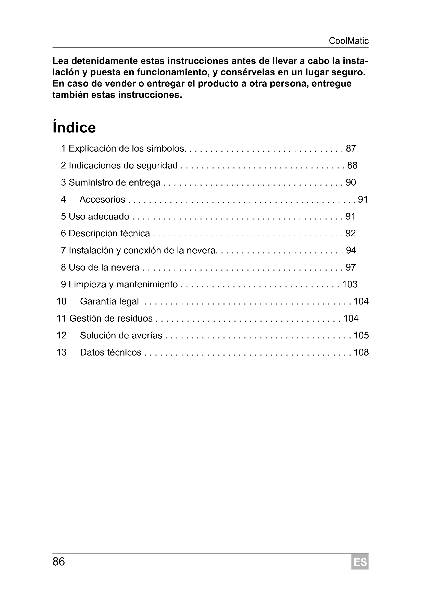 - 13 Datos técnicos ES CoolMatic Explicación de los símbolos p. 108