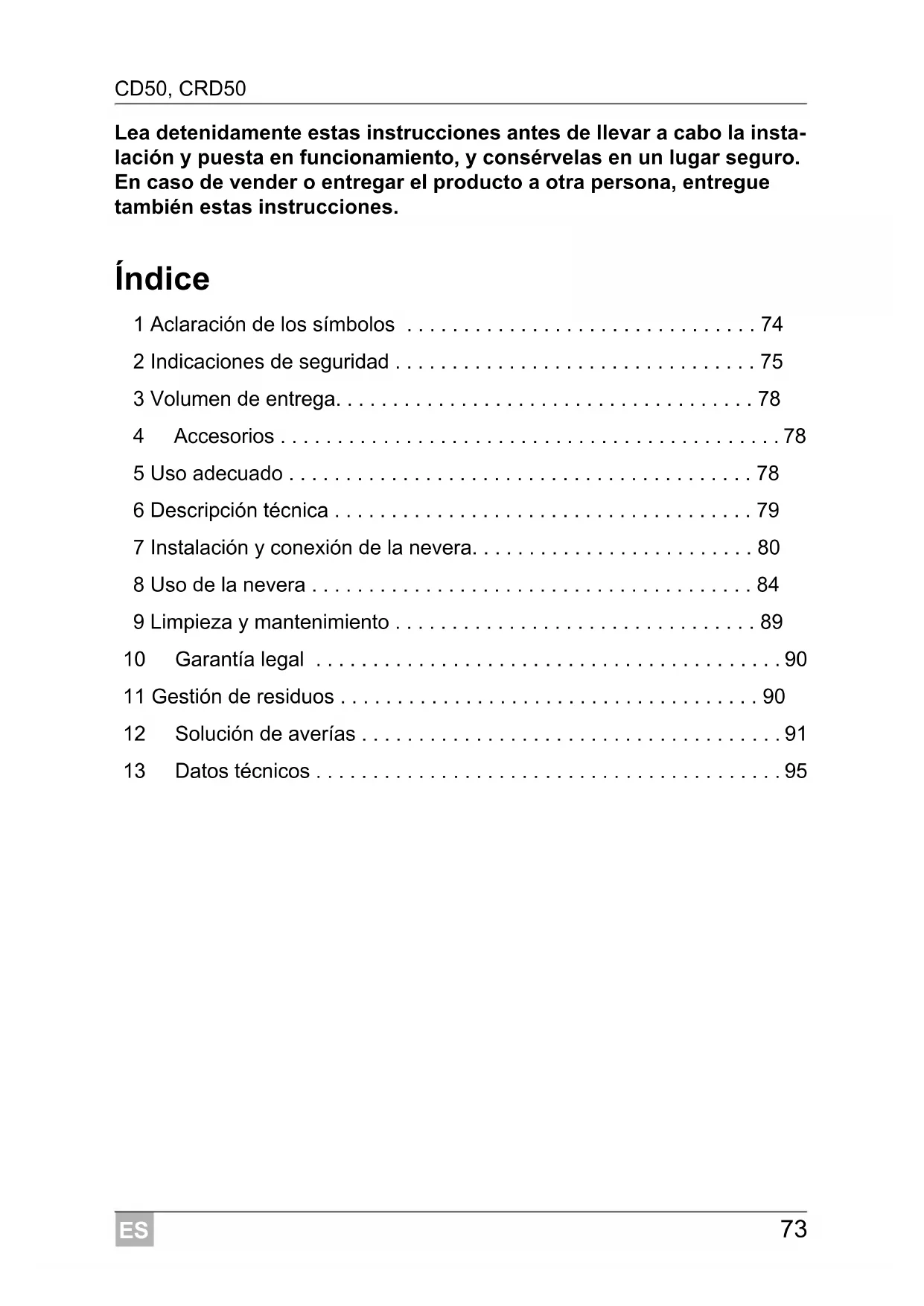 - 13 Datos técnicos ES Aclaración de los símbolos CD50, CRD50 p. 95