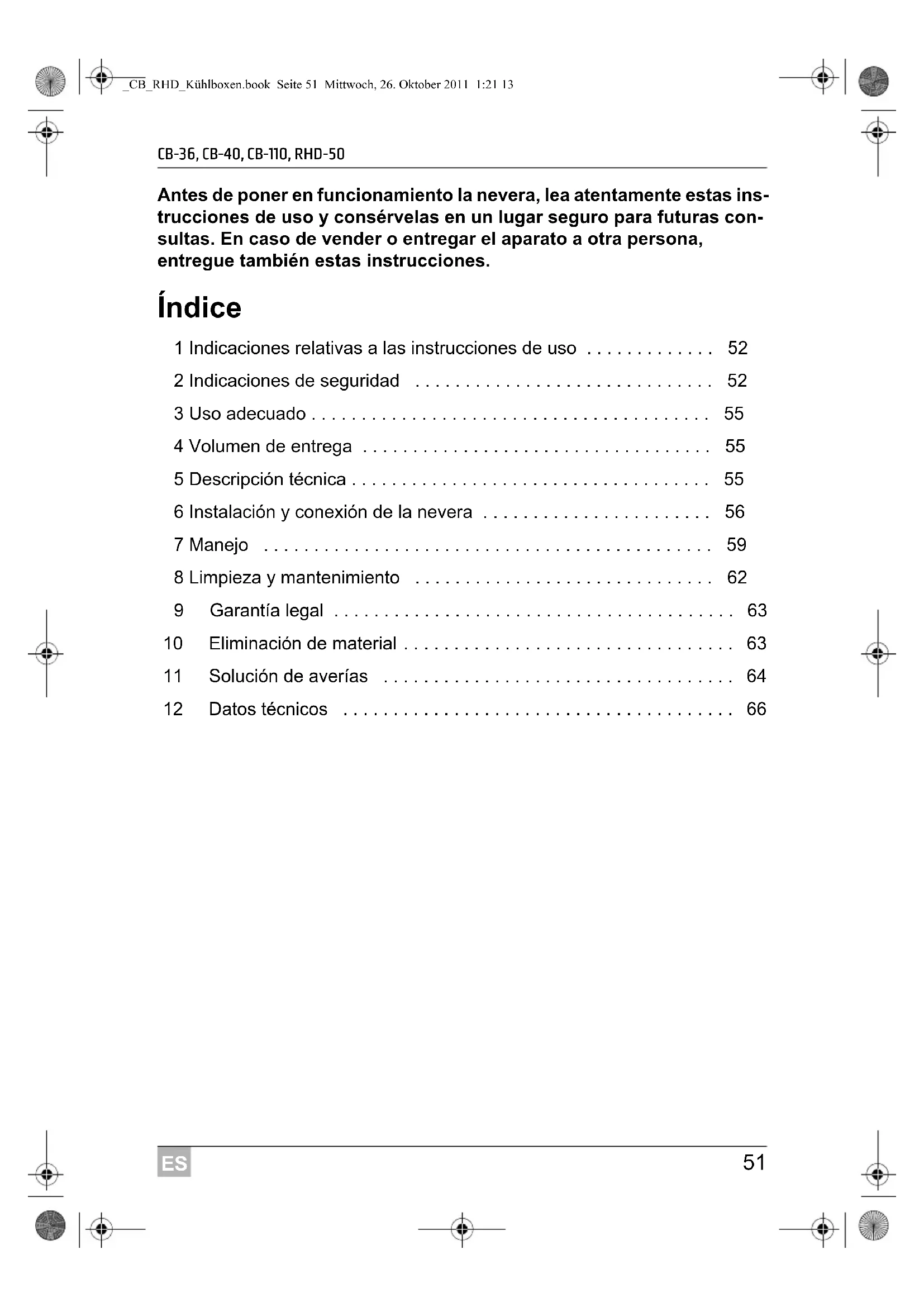 - 12 Datos técnicos _CB_RHD_Kühlboxen.book Seite 51 Mittwoch, 26. Oktober 2011 1:21 13ES Indicaciones relativas a las instrucciones de uso CB-36, CB-40, CB-110, RHD-50 p. 66