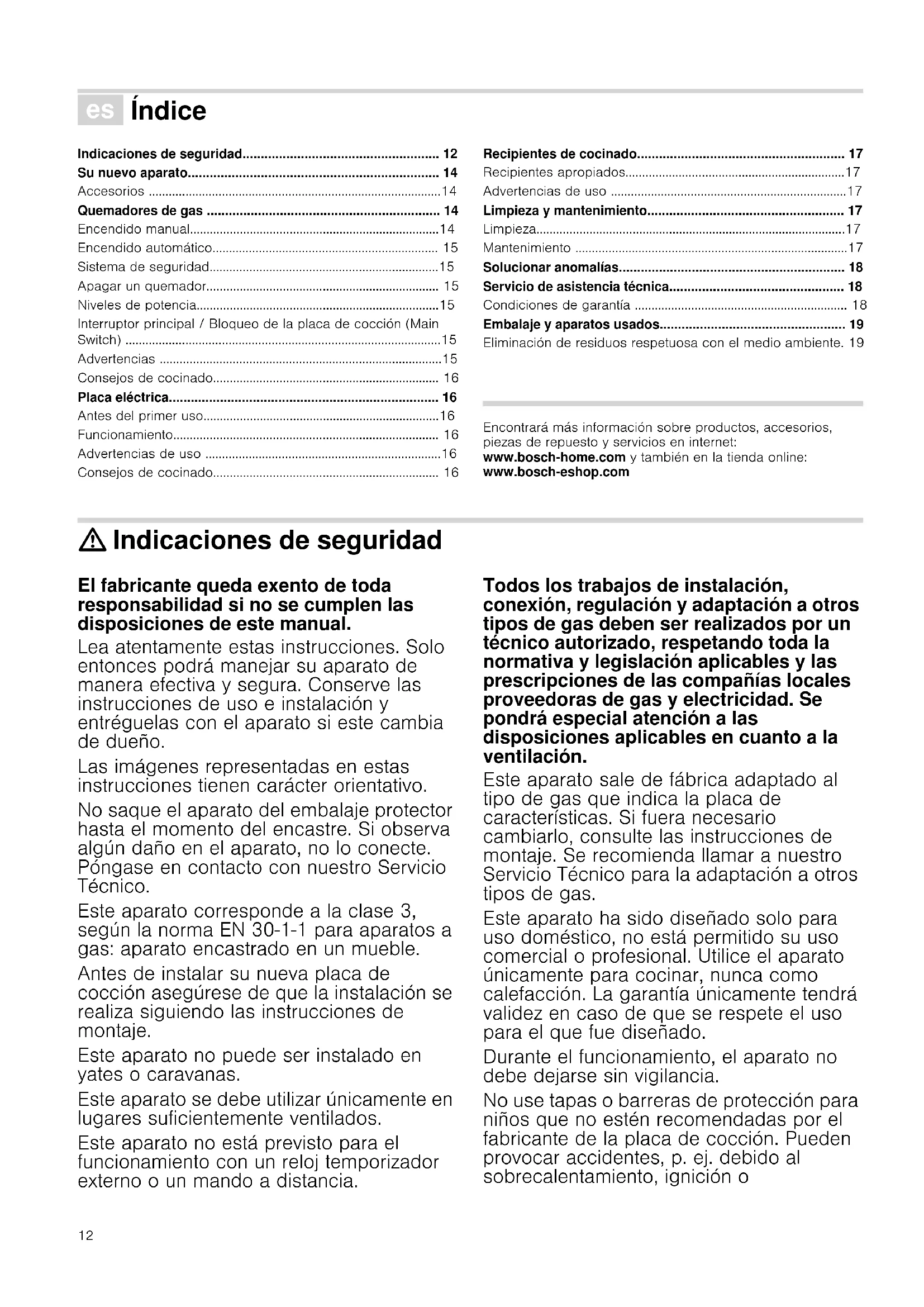 - Embalaje y aparatos usados Eliminación de residuos respetuosa con el medio ambiente. 19 Produktinfo Encontrará más información sobre productos, accesorios, piezas de repuesto y servicios en internet: www.bosch-home.com y también en la tienda online: www.bosch-eshop.com : Indicaciones de seguridad El fabricante queda exento de toda responsabilidad si no se cumplen las disposiciones de este manual. Lea atentamente estas instrucciones. Solo entonces podrá manejar su aparato de manera efectiva y segura. Conserve las instrucciones de uso e instalación y entréguelas con el aparato si este cambia de dueño. Las imágenes representadas en estas instrucciones tienen carácter orientativo. No saque el aparato del embalaje protector hasta el momento del encastre. Si observa algún daño en el aparato, no lo conecte. Póngase en contacto con nuestro Servicio Técnico. Este aparato corresponde a la clase 3, según la norma EN 30-1-1 para aparatos a gas: aparato encastrado en un mueble. Antes de instalar su nueva placa de cocción asegúrese de que la instalación se realiza siguiendo las instrucciones de montaje. Este aparato no puede ser instalado en yates o caravanas. Este aparato se debe utilizar únicamente en lugares suficientemente ventilados. Este aparato no está previsto para el funcionamiento con un reloj temporizador externo o un mando a distancia. Todos los trabajos de instalación, conexión, regulación y adaptación a otros tipos de gas deben ser realizados por un técnico autorizado, respetando toda la normativa y legislación aplicables y las prescripciones de las compañías locales proveedoras de gas y electricidad. Se pondrá especial atención a las disposiciones aplicables en cuanto a la ventilación. Este aparato sale de fábrica adaptado al tipo de gas que indica la placa de características. Si fuera necesario cambiarlo, consulte las instrucciones de montaje. Se recomienda llamar a nuestro Servicio Técnico para la adaptación a otros tipos de gas. Este aparato ha sido diseñado solo para uso doméstico, no está permitido su uso comercial o profesional. Utilice el aparato únicamente para cocinar, nunca como calefacción. La garantía únicamente tendrá validez en caso de que se respete el uso para el que fue diseñado. Durante el funcionamiento, el aparato no debe dejarse sin vigilancia. No use tapas o barreras de protección para niños que no estén recomendadas por el fabricante de la placa de cocción. Pueden provocar accidentes, p. ej. debido al sobrecalentamiento, ignición o13 desprendimiento de fragmentos de materiales. Este aparato puede ser utilizado por niños a partir de 8 años y personas que presenten limitaciones en sus facultades físicas, sensoriales o psíquicas o que carezcan de experiencia y conocimientos si son supervisados o han sido instruidos respecto al uso seguro del aparato y son conscientes de los peligros que conlleva su uso. No dejar que los niños jueguen con el aparato. La limpieza y el mantenimiento rutinario no debe encomendarse a los niños a menos que estén supervisados. ¡Peligro de deflagración! La acumulación de gas sin quemar en un recinto cerrado conlleva peligro de deflagración. No someta el aparato a corrientes de aire. Los quemadores podrían apagarse. Lea atentamente las instrucciones y advertencias relativas al funcionamiento de los quemadores de gas. ¡Peligro de intoxicación! El uso de un aparato de cocción a gas produce calor, humedad y productos de combustión en el local donde está instalado. Asegure una buena ventilación de la cocina, especialmente mientras la placa de cocción esté en funcionamiento: mantenga abiertos los orificios de ventilación natural o instale un dispositivo de ventilación mecánica (campana extractora). La utilización intensa y prolongada del aparato puede necesitar una ventilación complementaria o más eficaz: abra una ventana o aumente la potencia de la ventilación mecánica. ¡Peligro de quemaduras! Las zonas de cocción y adyacentes se calientan mucho. No toque nunca las superficies calientes. Mantenga alejados a los niños menores de 8 años. ¡Peligro de incendio! p. 19