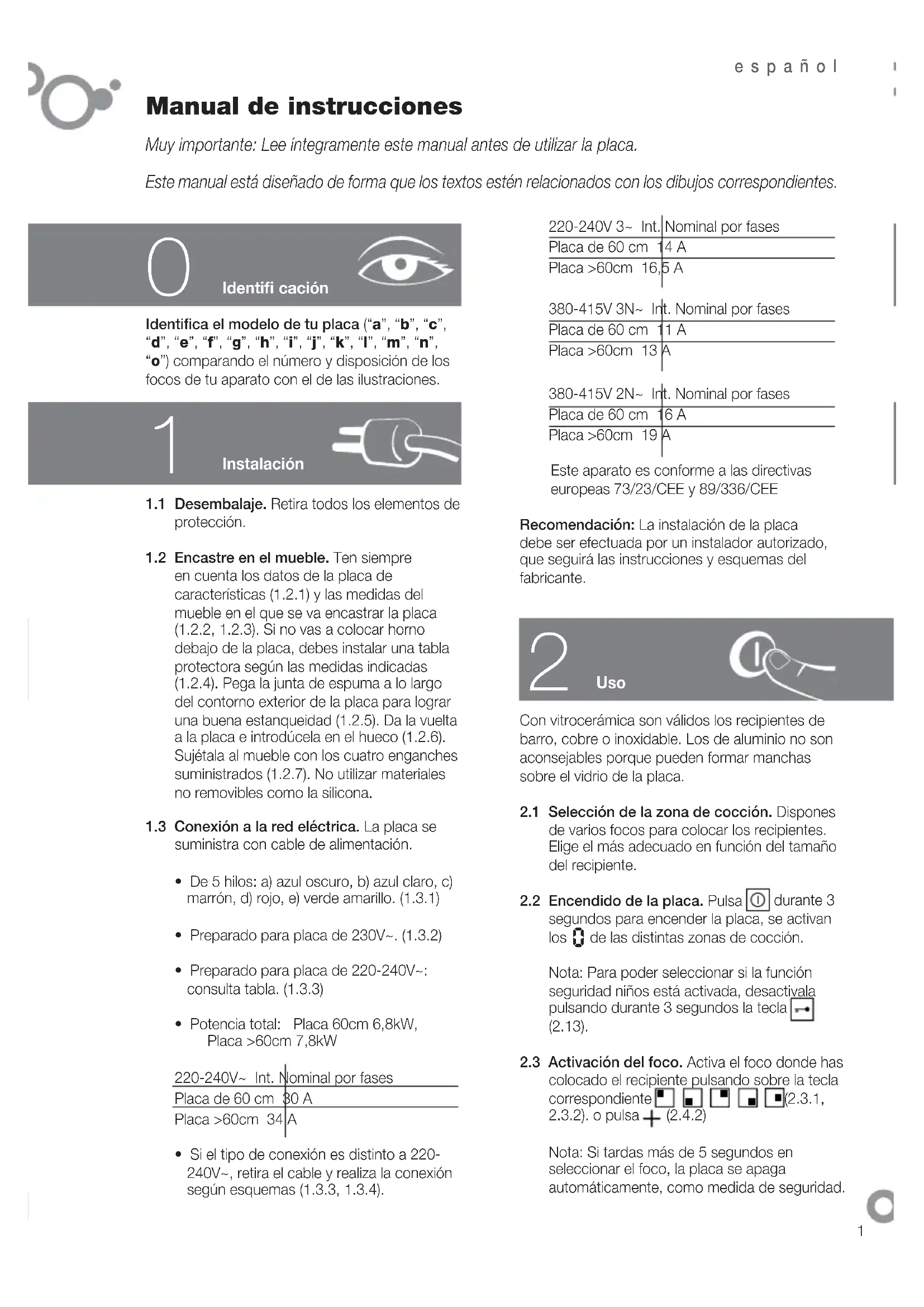 Instalación Uso Identifi ca el modelo de tu placa (“a”, “b”, “c”, “d”, “e”, “f”, “g”, “h”, “i”, “j”, “k”, “l”, “m”, “n”, “o”) comparando el número y disposición de los focos de tu aparato con el de las ilustraciones.1.1 Desembalaje. Retira todos los elementos de protección.1.2 Encastre en el mueble. Ten siempre en cuenta los datos de la placa de características (1.2.1) y las medidas del mueble en el que se va encastrar la placa (1.2.2, 1.2.3). Si no vas a colocar horno debajo de la placa, debes instalar una tabla protectora según las medidas indicadas (1.2.4). Pega la junta de espuma a lo largo del contorno exterior de la placa para lograr una buena estanqueidad (1.2.5). Da la vuelta a la placa e introdúcela en el hueco (1.2.6). Sujétala al mueble con los cuatro enganches suministrados (1.2.7). No utilizar materiales no removibles como la silicona.1.3 Conexión a la red eléctrica. La placa se suministra con cable de alimentación.• De 5 hilos: a) azul oscuro, b) azul claro, c) marrón, d) rojo, e) verde amarillo. (1.3.1)• Preparado para placa de 230V~. (1.3.2)• Preparado para placa de 220-240V~: consulta tabla. (1.3.3)• Potencia total: Placa 60cm 6,8kW, Placa >60cm 7,8kW220-240V~ Int. Nominal por fasesPlaca de 60 cm 30 APlaca >60cm 34 A• Si el tipo de conexión es distinto a 220-240V~, retira el cable y realiza la conexión según esquemas (1.3.3, 1.3.4).