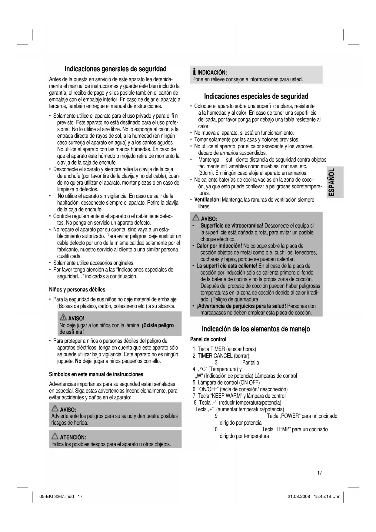 - ¡Advertencia de perjuicios para la salud! Personas con marcapasos no deben emplear esta placa de cocción. Indicación de los elementos de manejo Panel de control 1 Tecla TIMER (ajustar horas) 2 TIMER CANCEL (borrar) 3 Pantalla 4 „°C“ (Temperatura) y „W“ (Indicación de potencia) Lámparas de control 5 Lámpara de control (ON OFF) 6 “ON/OFF” (tecla de conexión/ desconexión) 7 Tecla “KEEP WARM” y lámpara de control 8 Tecla „-“ (reducir temperatura/potencia) Tecla „+“ (aumentar temperatura/potencia) 9 Tecla „POWER“ para un cocinado dirigido por potencia 10 Tecla “TEMP” para un cocinado dirigido por temperatura 05-EKI 3267.indd 1705-EKI 3267.indd 17 21.08.2008 15:45:18 Uhr21.08.2008 15:45:18 Uhr18 ESPAÑOL ESPAÑOL Aspectos generales Cocción con inducción Cuando se cocina con inducción se produce primero un calor por medio de las fuerzas magnéticas al colocar una cazuela o un sartén con fondo magnetizable sobre la zona de cocción conectada. Durante esto sólo se calienta el fondo de la batería de cocina, pero no la zona de cocción. Debajo de la placa de vitrocerámica se encuentra la bobina de inducción. Tan pronto se alimente la misma con corriente se produce un campo magnético que genera un remolino en el fondo de la cazuela o del sartén. De esta forma se consigue calentar el fondo. Esto ahorra energía, porque el calor sólo se produce donde realmente se necesita. ¿Qué tipo de batería de cocina se puede emplear? Para las placas de cocción por inducción se requieren cazuelas y fondos de cazuela de un material magnetizable. Las baterías de cocina se proveen hoy en día con la indicación que se apro- pian para la cocina de inducción. De principio se pueden emplear todas las baterías de cocina ferruginosas. Si estas son magnetizables se puede comprobar con un corto experimento: Coloque la cazuela correspondiente sobre la placa de cocción. Si después de haber seleccionado la función de cocción y co- nectado el equipo suena una señal no es apta la cazuela para la cocción por inducción. INDICACIÓN: Por razones de seguridad conmuta el equipo después de pocos segundos al estado de reserva. Los siguientes materiales no se pueden emplear como baterías de cocina para la cocción por inducción: Arcilla, cristal o aluminio. Las siguientes cazuelas no se pueden emplear: Cazuelas con fondo redondo. Cazuelas cuyo diá- metro en el fondo sea menor de 12cm. Cazuelas con pies. Conexión eléctrica Potencia conectada La placa de cocción puede absorber una potencia total de 2000 W. Para esta potencia conectada se recomienda una línea de alimentación separada con una protección por fusible a través de un interruptor de protección doméstico de 16A. AVISO DE SOBRECARGA! No emplee líneas de prolongación ni cajas de enchufe múltip- les, ya que este equipo es muy potente. Conexión