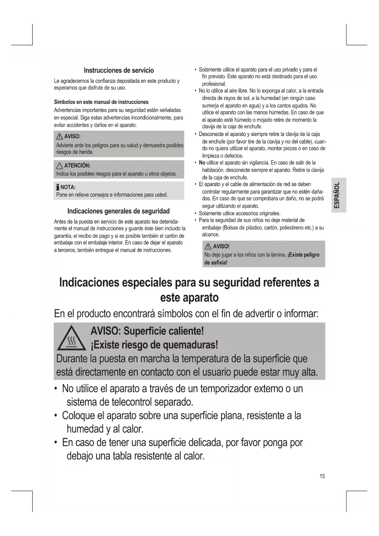 - Para la seguridad de sus niños no deje material de embalaje (Bolsas de plástico, cartón, poliestireno etc.) a su alcance. AVISO! No deje jugar a los niños con la lámina. ¡Existe peligro de asxia! Indicaciones especiales para su seguridad referentes a este aparato En el producto encontrará símbolos con el n de advertir o informar: AVISO: Supercie caliente! ¡Existe riesgo de quemaduras! Durante la puesta en marcha la temperatura de la supercie que está directamente en contacto con el usuario puede estar muy alta.