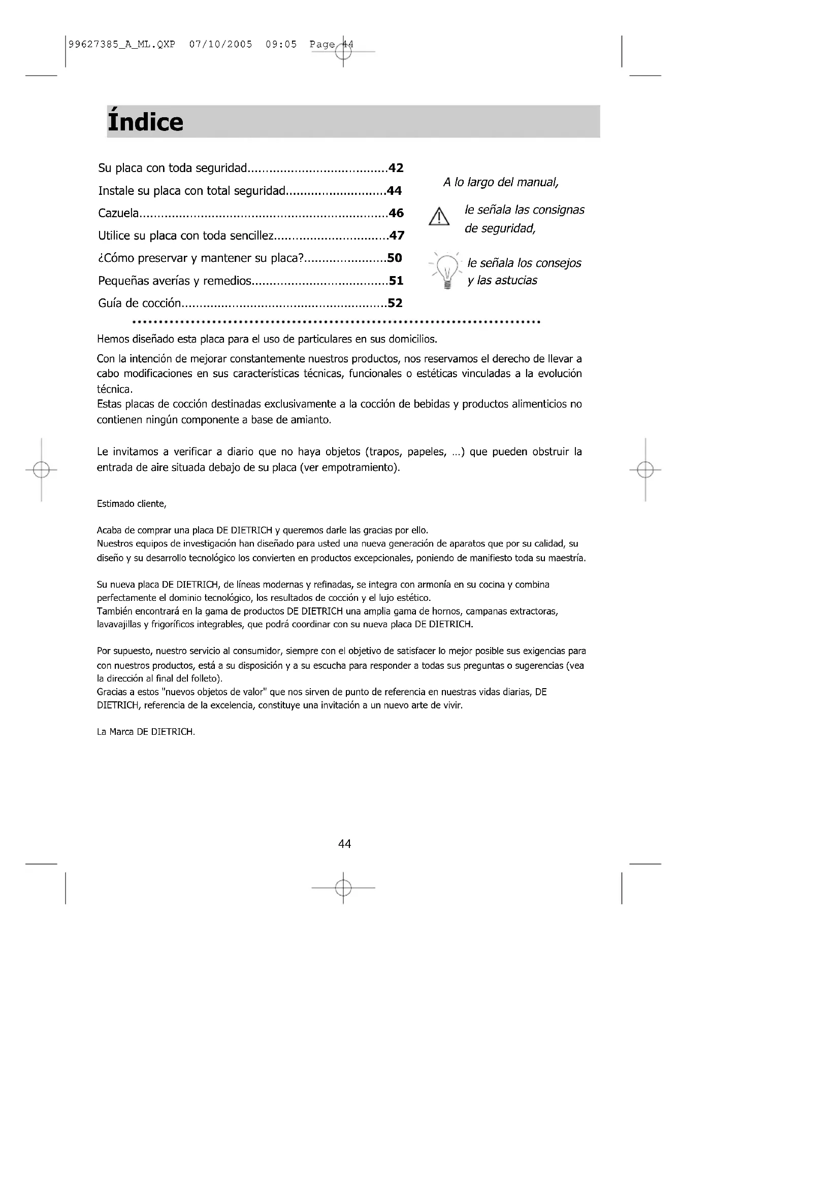 - 99627385_A_ML.QXP 07/10/2005 09:05 Page 4344 Estimado cliente, Acaba de comprar una placa DE DIETRICH y queremos darle las gracias por ello. Nuestros equipos de investigación han diseñado para usted una nueva generación de aparatos que por su calidad, su diseño y su desarrollo tecnológico los convierten en productos excepcionales, poniendo de manifiesto toda su maestría. Su nueva placa DE DIETRICH, de líneas modernas y refinadas, se integra con armonía en su cocina y combina perfectamente el dominio tecnológico, los resultados de cocción y el lujo estético. También encontrará en la gama de productos DE DIETRICH una amplia gama de hornos, campanas extractoras, lavavajillas y frigoríficos integrables, que podrá coordinar con su nueva placa DE DIETRICH. Por supuesto, nuestro servicio al consumidor, siempre con el objetivo de satisfacer lo mejor posible sus exigencias para con nuestros productos, está a su disposición y a su escucha para responder a todas sus preguntas o sugerencias (vea la dirección al final del folleto). Gracias a estos "nuevos objetos de valor" que nos sirven de punto de referencia en nuestras vidas diarias, DE DIETRICH, referencia de la excelencia, constituye una invitación a un nuevo arte de vivir. La Marca DE DIETRICH. A lo largo del manual, le señala las consignas de seguridad, le señala los consejos y las astucias Su placa con toda seguridad p. 42