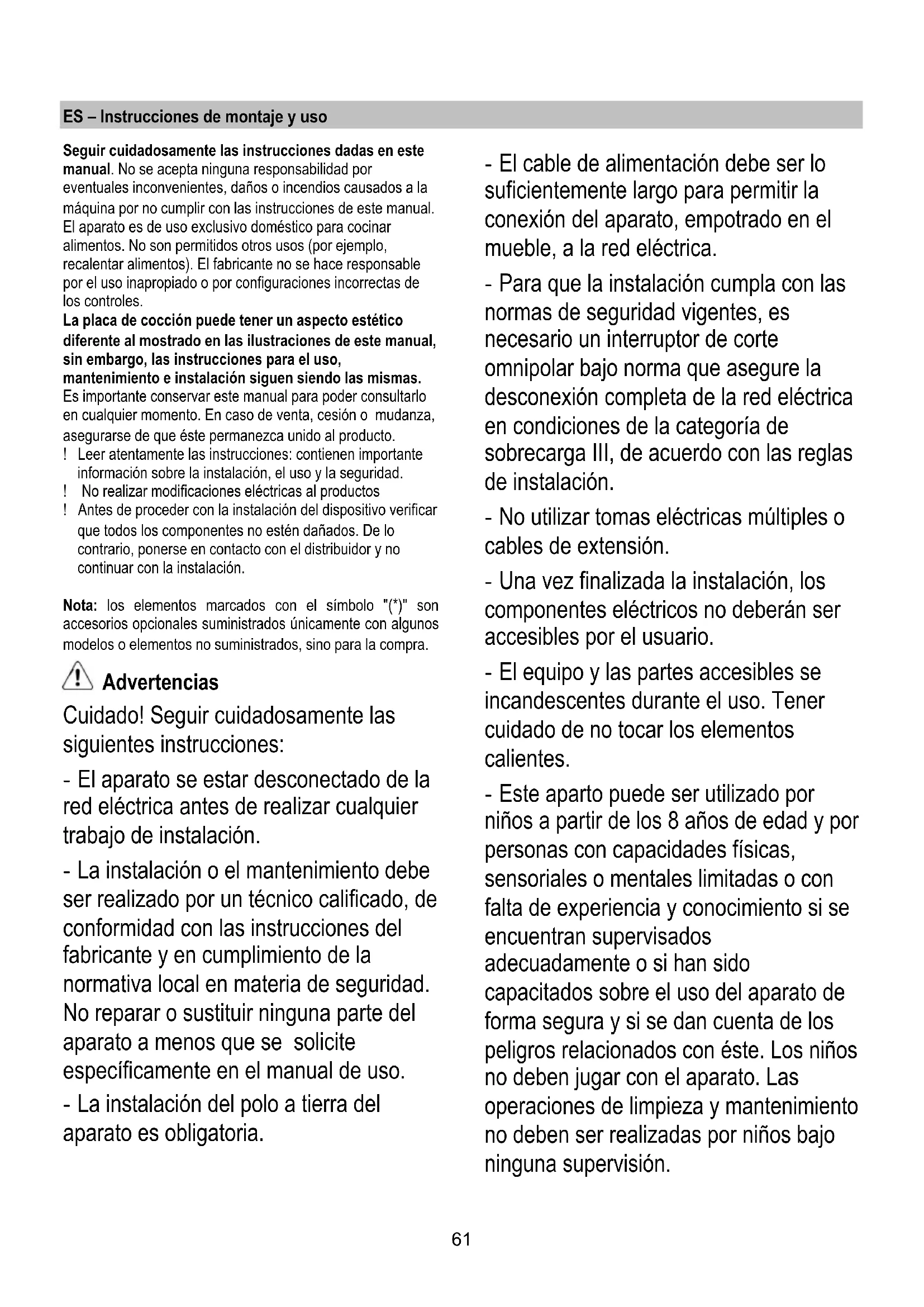 vergewissern, dass die Störung behoben worden ist. Wenn die Störung nach diesen Prüfungen bleibt, den nächsten Kundendienst in der Nähe kontaktieren.61 ES – Instrucciones de montaje y uso Seguir cuidadosamente las instrucciones dadas en este manual. No se acepta ninguna responsabilidad por eventuales inconvenientes, daños o incendios causados a la máquina por no cumplir con las instrucciones de este manual. El aparato es de uso exclusivo doméstico para cocinar alimentos. No son permitidos otros usos (por ejemplo, recalentar alimentos). El fabricante no se hace responsable por el uso inapropiado o por configuraciones incorrectas de los controles. La placa de cocción puede tener un aspecto estético diferente al mostrado en las ilustraciones de este manual, sin embargo, las instrucciones para el uso, mantenimiento e instalación siguen siendo las mismas. Es importante conservar este manual para poder consultarlo en cualquier momento. En caso de venta, cesión o mudanza, asegurarse de que éste permanezca unido al producto. ! Leer atentamente las instrucciones: contienen importante información sobre la instalación, el uso y la seguridad. ! No realizar modificaciones eléctricas al productos ! Antes de proceder con la instalación del dispositivo verificar que todos los componentes no estén dañados. De lo contrario, ponerse en contacto con el distribuidor y no continuar con la instalación. Nota: los elementos marcados con el símbolo "(*)" son accesorios opcionales suministrados únicamente con algunos modelos o elementos no suministrados, sino para la compra.