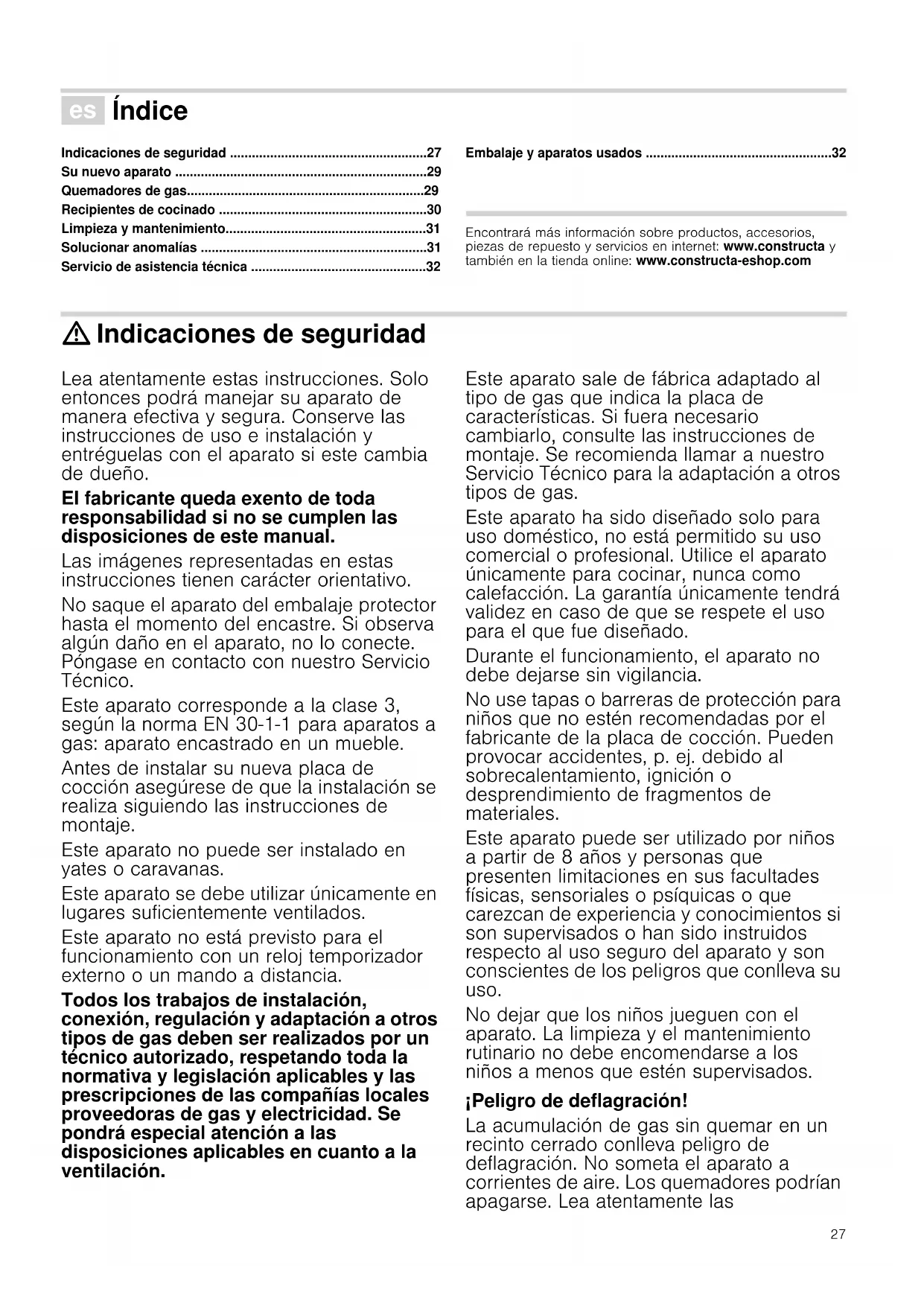 - Emballage et appareils usagés Produktinfo Vous trouverez des informations supplementaires concernant les produits, accessoires, pièces de rechange et services sur Internet sous : www.constructa.de et la boutique en ligne : www.constructa-eshop.com : Consignes de sécurité Lisez attentivement ces instructions. Ce n'est qu'à cette condition que vous pourrez utiliser votre appareil efficacement et en toute sécurité.Conservez la notice d'utilisation et d'installation, et remettez-la avec l'appareil si celui-ci change de propriétaire. Le fabricant est exempt de toute responsabilité si les instructions de cette notice ne sont pas respectées. Les images de cette notice sont proposées à titre indicatif. Ne retirez l'appareil de son emballage protecteur qu'au moment de son encastrement. Si vous constatez des dommages sur l'appareil, ne le branchez pas.Contactez notre Service Technique. Cet appareil correspond à la classe 3, selon la norme EN 30-1-1 pour les appareils à gaz : appareil encastré dans un meuble. Assurez-vous que l'installation de votre plaque de cuisson est réalisée dans le respect de la notice de montage. Cet appareil ne peut pas être installé dans des yachts ou des caravanes. Cet appareil doit être utilisé uniquement dans des endroits suffisamment ventilés. Cet appareil n'est pas conçu pour un fonctionnement avec une minuterie externe ou une commande à distance. Tous les travaux d'installation, de branchement, de réglage et d'adaptation à un autre type de gaz doivent être réalisés par un technicien agréé qui doit respecter les normes et la législation applicables, ainsi que les prescriptions des sociétés locales de distribution d'électricité et de gaz. Les dispositions applicables quant à la ventilation seront attentivement respectées. En sortie d'usine, cet appareil est adapté au type de gaz indiqué sur la plaque signalétique. S'il était nécessaire de le changer, veuillez consulter la notice de montage.Il est recommandé de faire appel à notre service technique pour l'adaptation à un autre type de gaz. Cet appareil a été conçu pour une utilisation domestique ; son utilisation à titre commercial ou professionnel est interdite. N'utilisez l'appareil que pour cuisiner, jamais comme chauffage.La garantie ne sera valable que si l'utilisation pour laquelle il a été conçu a été respectée. Ne laissez pas l'appareil sans surveillance pendant son fonctionnement. N'utilisez pas de couvercles ou de barrières de protection pour enfants non recommandés par le fabricant de la plaque de cuisson.Ils peuvent provoquer des accidents, notamment en raison de la surchauffe, de la combustion ou du décollement de fragments de matériaux. Cet appareil peut être utilisée par des enfants âgés de plus de 8 ans et par des personnes ayant des capacités physiques, sensorielles ou mentales restreintes ou ayant un manque d'expérience ou de connaissances, s'ils sont surveillés ou si une personne les a instruits de la manipulation de l'appareil en toute sécurité et s'ils ont compris les dangers qui en résultent. Les enfants ne doivent pas jouer avec l'appareil. Le nettoyage et l'entretien incombant à l'utilisateur ne doivent pas être effectués par des enfants sans surveillance. Risque de déflagration ! L'accumulation de gaz non brûlés dans un lieu fermé pourrait comporter un risque de déflagration. Ne placez pas l'appareil dans34 des courants d'air. Les brûleurs pourraient s'éteindre. Lisez attentivement les instructions et les avertissements concernant le fonctionnement des brûleurs à gaz. Risque d'intoxication ! L'utilisation d'un appareil de cuisson à gaz produit de la chaleur, de l'humidité et émet des produits de combustion dans la pièce où il est installé. Assurez-vous que la cuisine soit bien ventilée, en particulier lorsque la plaque de cuisson est en fonctionnement: laissez les orifices de ventilation naturelle ouverts ou installez un dispositif de ventilation mécanique (hotte aspirante).Lorsque l'utilisation de l'appareil est intense et prolongée, une ventilation complémentaire ou plus efficace peut être nécessaire: ouvrez une fenêtre ou augmentez la puissance de la ventilation mécanique. Risque de brûlures ! Les zones de cuisson et les zones adjacentes chauffent fortement.Ne touchez pas les surfaces chaudes. Ne laissez pas les enfants de moins de 8 ans s'approcher. Risque d'incendie ! p. 38