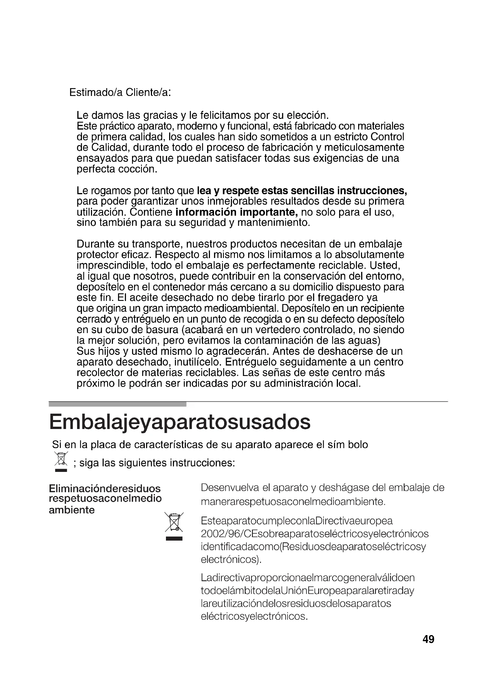 LEstimado/a Cliente/a: Le damos las gracias y le felicitamos por su elección. Este práctico aparato, moderno y funcional, está fabricado con materiales de primera calidad, los cuales han sido sometidos a un estricto Control de Calidad, durante todo el proceso de fabricación y meticulosamente para poder garantizar unos inmejorables resultados desde su primera utilización. Contiene información importante, no solo para el uso, sino también para su seguridad y mantenimiento. Durante su transporte, nuestros productos necesitan de un embalaje protector eficaz. Respecto al mismo nos limitamos a lo absolutamente imprescindible, todo el embalaje es perfectamente reciclable. Usted, al igual que nosotros, puede contribuir en la conservación del entorno, deposítelo en el contenedor más cercano a su domicilio dispuesto para este fin. El aceite desechado no debe tirarlo por el fregadero ya que origina un gran impacto medioambiental. Deposítelo en un recipiente cerrado y entréguelo en un punto de recogida o en su defecto deposítelo en su cubo de basura (acabará en un vertedero controlado, no siendo Sus hijos y usted mismo lo agradecerán. Antes de deshacerse de un aparato desechado, inutilícelo. Entréguelo seguidamente a un centro recolector de materias reciclables. Las señas de este centro más