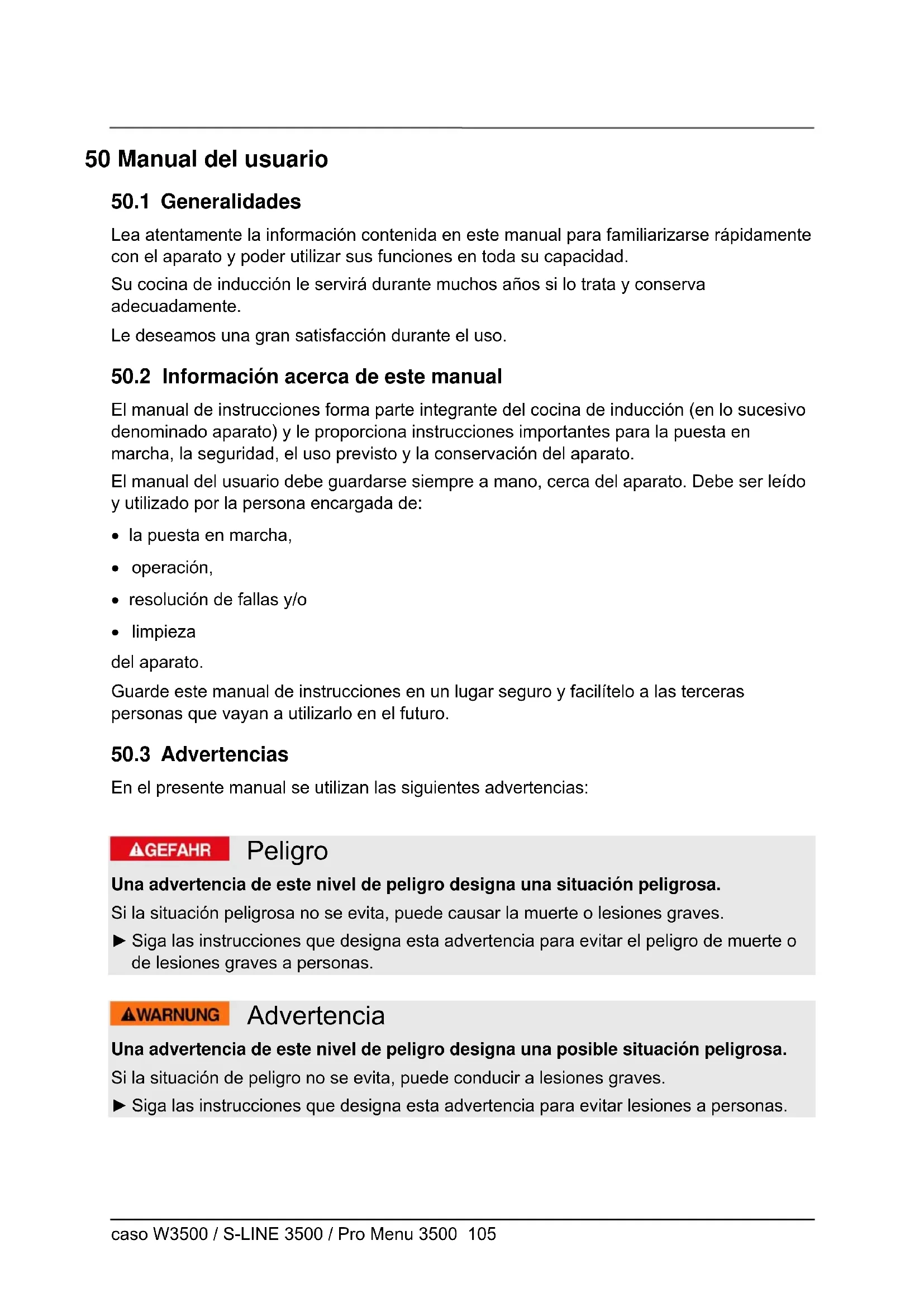 En el presente manual se utilizan las siguientes advertencias: Peligro Una advertencia de este nivel de peligro designa una situación peligrosa. Si la situación peligrosa no se evita, puede causar la muerte o lesiones graves. ► Siga las instrucciones que designa esta advertencia para evitar el peligro de muerte o de lesiones graves a personas. Advertencia Una advertencia de este nivel de peligro designa una posible situación peligrosa. Si la situación de peligro no se evita, puede conducir a lesiones graves. ► Siga las instrucciones que designa esta advertencia para evitar lesiones a personas.caso W3500 / S-LINE 3500 / Pro Menu 3500 106 Precaución Una advertencia de este nivel de peligro designa una posible situación peligrosa. Si la situación de peligro no se evita, puede conducir a lesiones de gravedad moderada a leve. ► Siga las instrucciones que designa esta advertencia para evitar lesiones a personas. Nota Esta indicación proporciona información adicional que facilitará el manejo de la máquina.