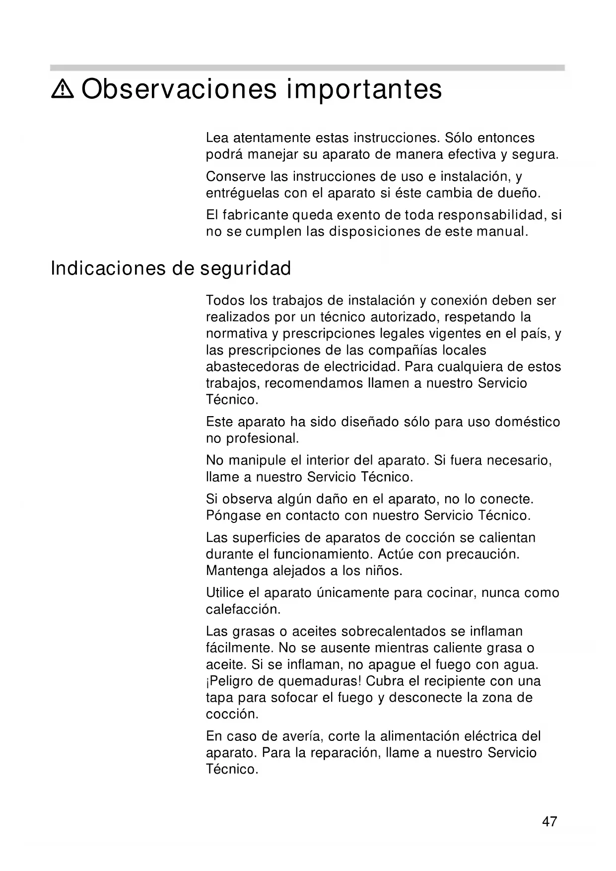 Indicaciones de seguridad ............................................ Desmontaje de la placa de cocción ........................... 54m Observaciones importantes Lea atentamente estas instrucciones. Sólo entonces podrá manejar su aparato de manera efectiva y segura. Conserve las instrucciones de uso e instalación, y entréguelas con el aparato si éste cambia de dueño. El fabricante queda exento de toda responsabilidad, si no se cumplen las disposiciones de este manual. Indicaciones de seguridad Todos los trabajos de instalación y conexión deben ser realizados por un técnico autorizado, respetando la normativa y prescripciones legales vigentes en el país, y las prescripciones de las compañías locales abastecedoras de electricidad. Para cualquiera de estos trabajos, recomendamos llamen a nuestro Servicio Técnico. Este aparato ha sido diseñado sólo para uso doméstico no profesional. No manipule el interior del aparato. Si fuera necesario, llame a nuestro Servicio Técnico. Si observa algún daño en el aparato, no lo conecte. Póngase en contacto con nuestro Servicio Técnico. Las superficies de aparatos de cocción se calientan durante el funcionamiento. Actúe con precaución. Mantenga alejados a los niños. Utilice el aparato únicamente para cocinar, nunca como calefacción. Las grasas o aceites sobrecalentados se inflaman fácilmente. No se ausente mientras caliente grasa o aceite. Si se inflaman, no apague el fuego con agua. ¡Peligro de quemaduras! Cubra el recipiente con una tapa para sofocar el fuego y desconecte la zona de cocción. En caso de avería, corte la alimentación eléctrica del aparato. Para la reparación, llame a nuestro Servicio Técnico. 47No utilice máquinas de limpieza a vapor para limpiar el aparato. ¡Peligro de electrocución! Los gráficos representados en este manual de instrucciones son orientativos. Placas eléctricas Antes del primer uso Para eliminar el olor a nuevo, conecte las zonas de cocción, de una en una y sin recipiente, a la máxima potencia durante cinco minutos. No conecte más de una zona de cocción a la vez. Durante este tiempo es normal que se desprendan humo y olores, con el tiempo irán desapareciendo. No utilice las zonas de cocción sin recipientes, excepto en este primer calentamiento. Funcionamiento Cómo encender deseada. Posición 1: mínima potencia. Posición 6 ó 9 (según modelo): máxima potencia. Se recomienda utilizar la máxima potencia al inicio de la cocción, y pasar a niveles de potencia intermedios transcurridos unos minutos. Calor residual Las placas eléctricas se pueden apagar un poco antes de acabar la cocción. El calor residual le permitirá !¡ Atención Consejo continuar la cocción durante unos minutos y, de este modo, ahorrar energía.
