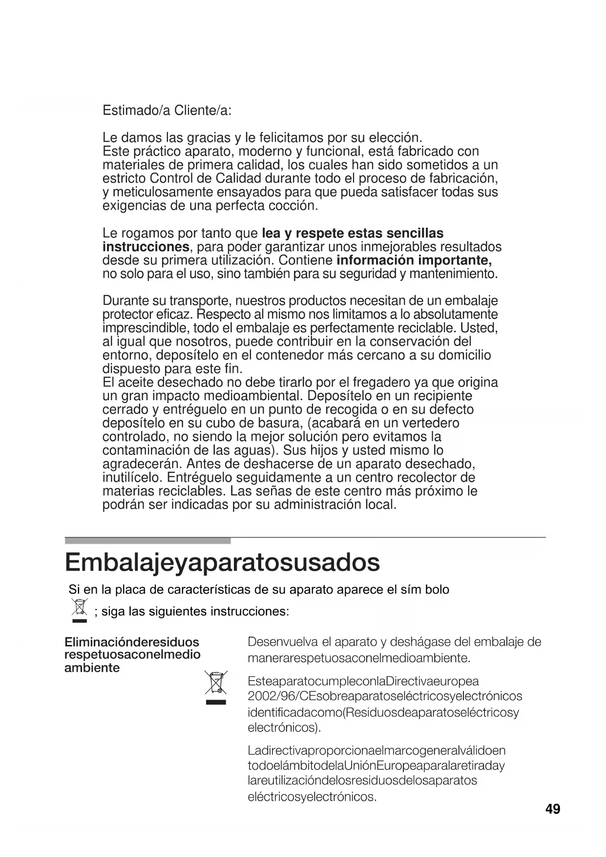 Protección contra sobrecalentamientoAdvertencias de seguridad Lea atentamente este manual de uso para cocinar en este aparato de una manera efectiva y segura. Según la normativa vigente, la instalación y transformación de gas sólo puede ser realizada por un técnico autorizado oficialmente. Antes de instalar su nueva placa de cocción compruebe que las medidas son las correctas. Las siguientes instrucciones solamente son válidas para los países cuyo símbolo aparece en el aparato, es necesario recurrir a las instrucciones técnicas para la adaptación del mismo a las condiciones de utilización del país. Es indispensable que el lugar donde esté instalado el aparato disponga de la ventilación reglamentaria en perfecto estado de uso. No permita que el aparato sufra fuertes corrientes de aire, ya que podrían apagarse los quemadores. Este aparato sale de fábrica ajustado al gas que indica la placa de características. Si fuera necesario un cambio llame a nuestro servicio de asistencia técnica. No manipule el aparato en su interior. En caso de ser necesario, llame a nuestro servicio de asistencia técnica. Guarde bien las instrucciones de uso y montaje, para poder entregarlas junto con el aparato, si el mismo cambia de dueño. Si su placa de cocción posee un panel de cristal, no aplique fuerzas excesivas sobre él. En caso de que su placa de cocción presente el cristal despegado, llame inmediatamente a nuestro servicio de asistencia técnica, para que proceda a su reparación o sustitución. No ponga en funcionamiento un aparato dañado. Las superficies de aparatos de calefacción y cocción se Mantenga siempre alejados a los niños. calientan durante el funcionamiento, actúe con precaución. 51Utilice el aparato únicamente para la preparación de comidas, nunca como calefacción. Grasas o aceites calentados excesivamente pueden inflamarse fácilmente. Por ello la preparación de comidas con grasas o aceites, por ejemplo patatas fritas, deben ser vigiladas. No echar nunca agua si la grasa o aceite están ardiendo ¡PELIGRO! De quemaduras, cubra el recipiente para sofocar el fuego y desconecte la zona de cocción. En caso de avería, corte la alimentación de gas y elec- tricidad del aparato. Para su reparación llame a nuestro servicio de asistencia técnica. No coloque recipientes deformados que se muestren inestables sobre placas y quemadores, para evitar que se puedan volcar accidentalmente. Si un grifo se agarrota, no hay que forzarlo. Llame inmediatamente a nuestro servicio técnico oficial, para que proceda a su reparación o sustitución. Los gráficos representados en este libro de instrucciones son orientativos. No utilice máquinas de limpieza a vapor para limpiar la placa de cocción, ya que hay riesgo de electrocución.
