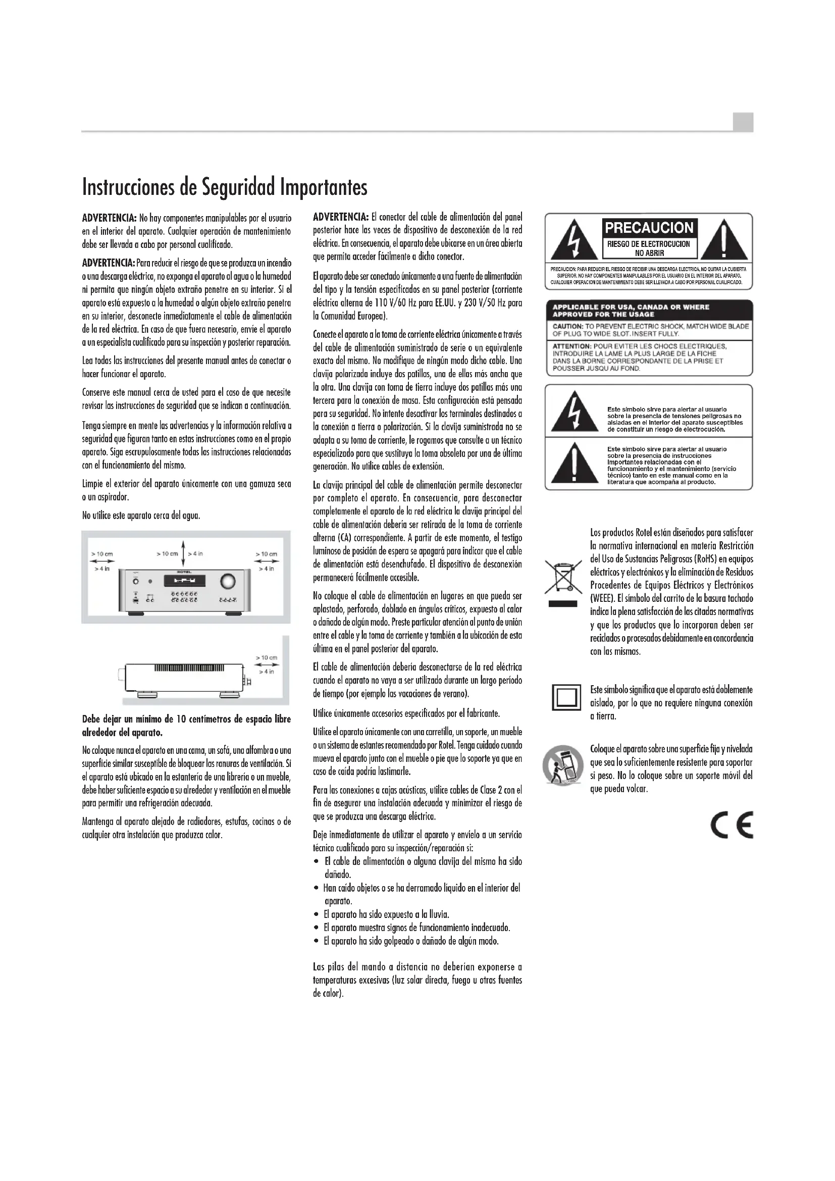 Utilice el aparato unicolemente conuna carreilla,un soporte,un mueble o unsystema de estantes recomendado por Rotel.Tenga cuidado cuando可以更好 el aparato junfo con el mueble o pie que lo soporte ya que en caso de caida podra lastimarle.