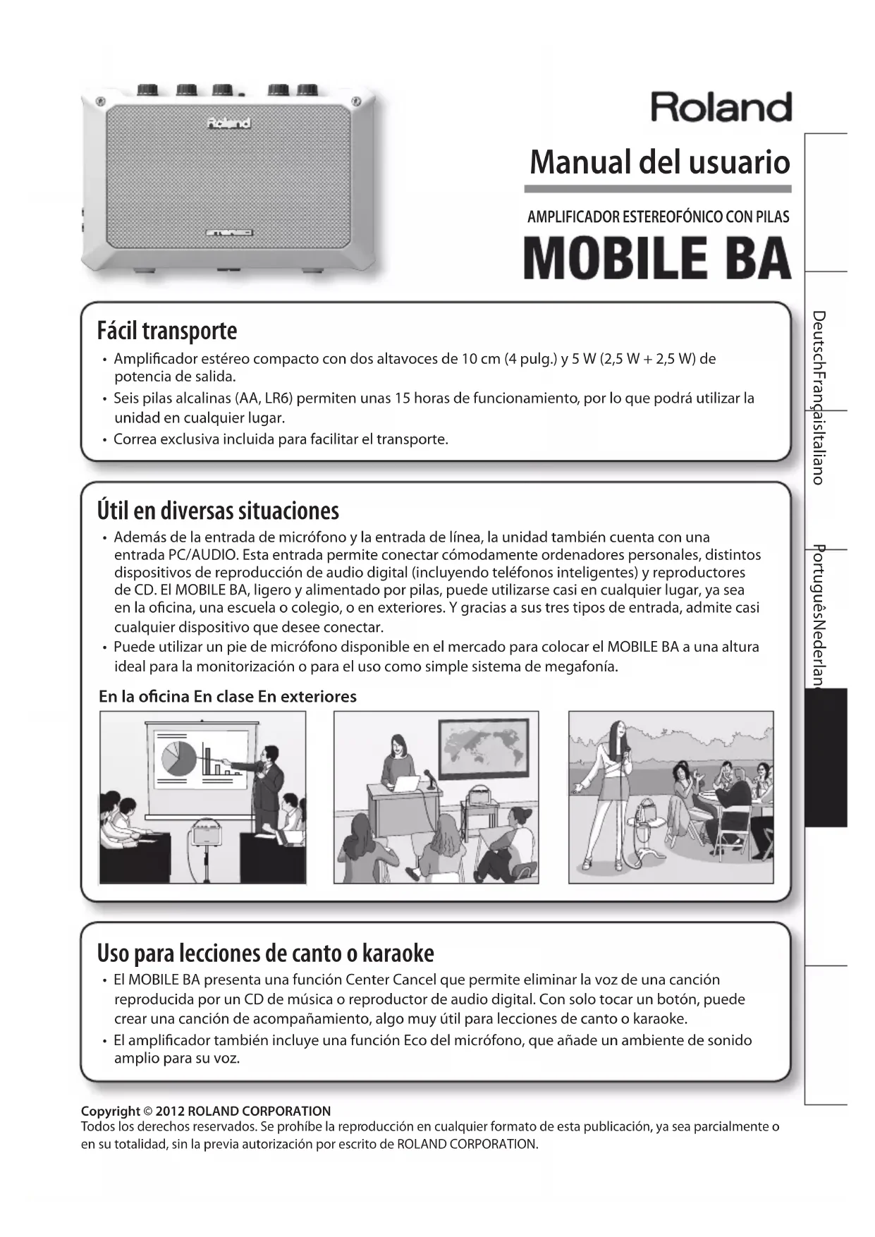 - Correa exclusiva incluida para facilitar el transporte. Copyright © 2012 ROLAND CORPORATION Todos los derechos reservados. Se prohíbe la reproducción en cualquier formato de esta publicación, ya sea parcialmente o en su totalidad, sin la previa autorización por escrito de ROLAND CORPORATION. Útil en diversas situaciones