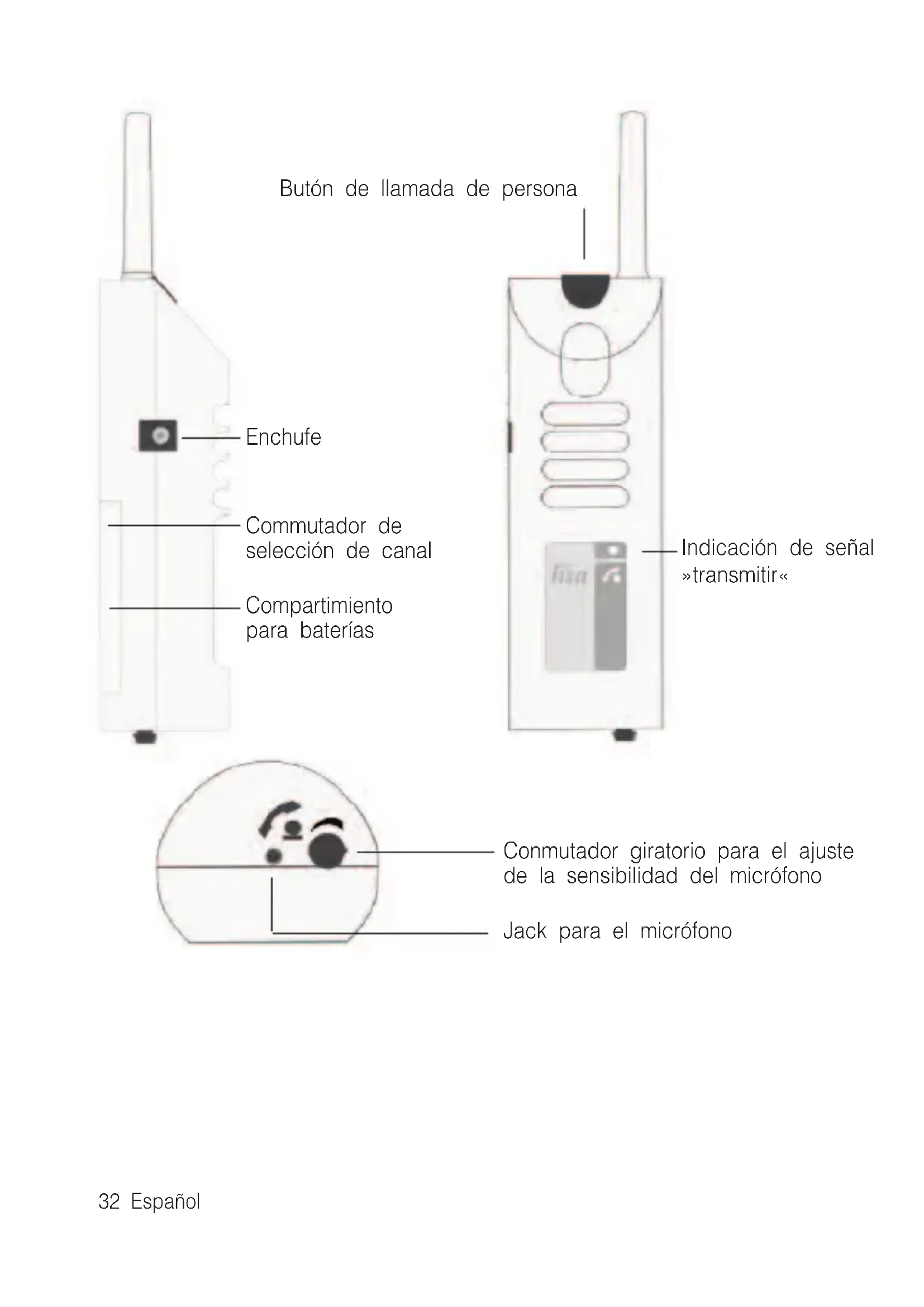 Presionando el botón de llama de persona del radioemisortelefónica acústicoseactivará una senal en todos los receptores ajustados en el mismo canal. Usted reconcerá este al iluminarse la luz indicadora para la llama de persona. De esta manière, se pueda llamar personas en otheras habitaciones. Con este botón adicionalmente seoulda comprobar el funcionajo de la instalación sin conectar el cable de microfono.