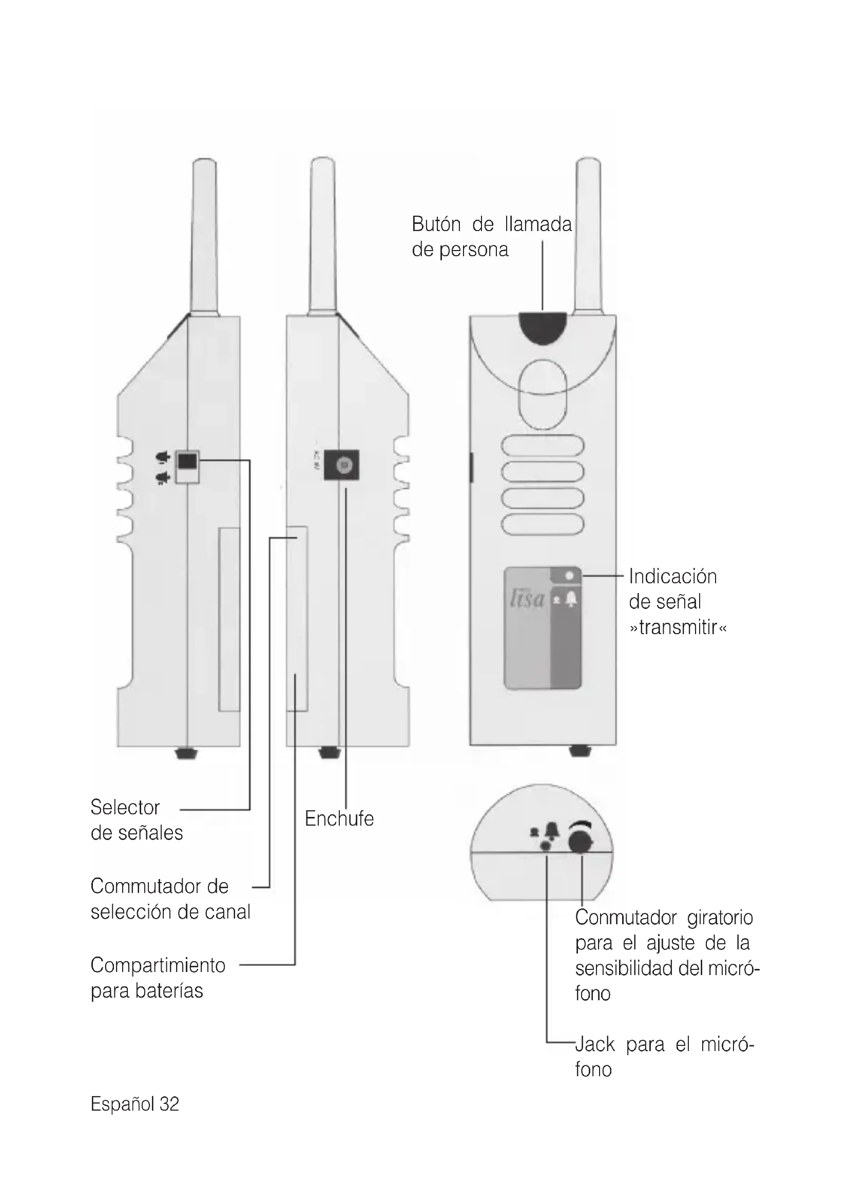 Presionando el botón de llama de persona del radioemisor de tiempo de la puerta seactivará una seals en todos los receptores ajustados en el本身就是 canal. Usted reconecerá este al iluminarse la luz indicadora para la llama de persona. De estaforma, se pueda llamar personas en other habitaciones. Con este botón adicionalmente seoulda comprobar el funciona de la instalacion sin conectar el cable de micrófono.