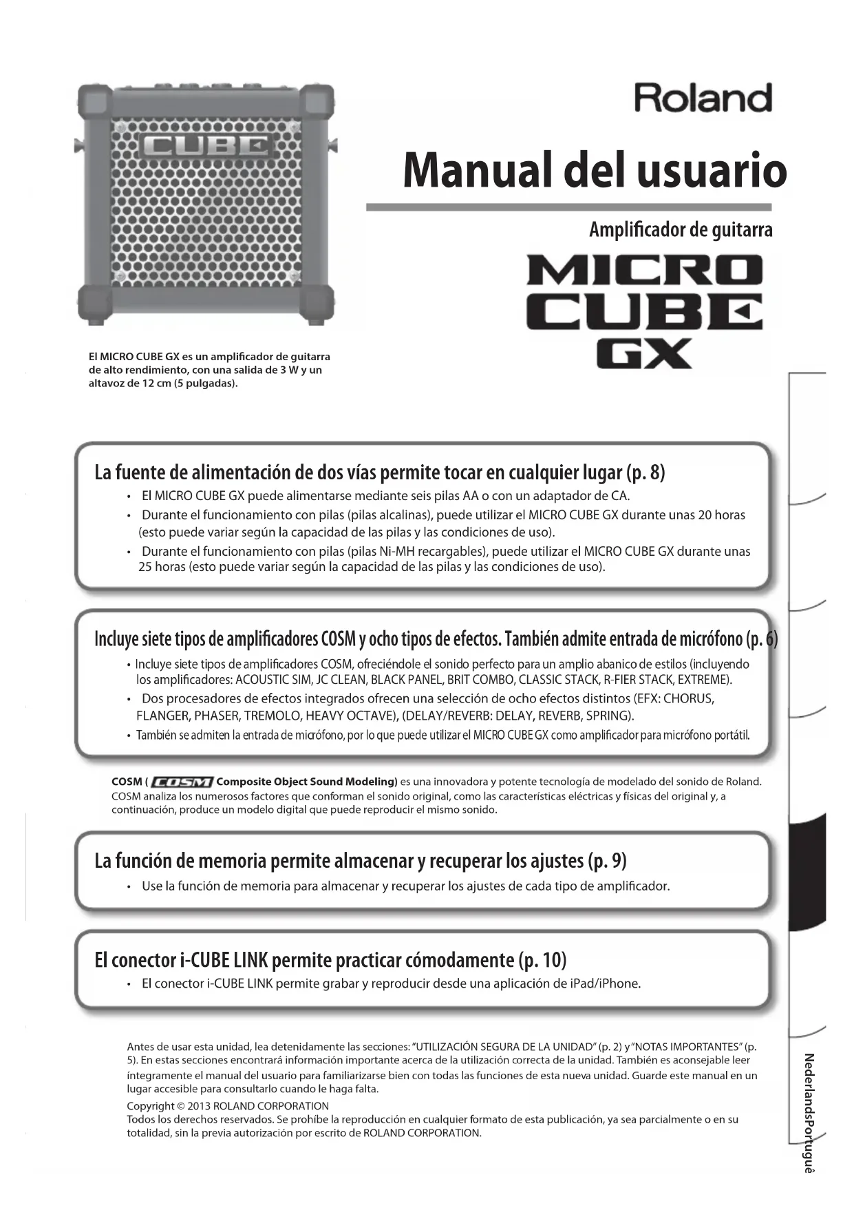 Descripciones de los paneles 1 Conector INPUT Conecte aquí la guitarra o el micrófono.* Según la posición de los micrófonos con respecto a los altavoces, es posible que se produzcan acoples. Esto se puede evitar:1. Cambiando la orientación del micrófono o micrófonos.2. Colocando el micrófono o micrófonos más lejos de los altavoces.3. Bajando el volumen.* Para evitar deciencias de funcionamiento y fallos en los equipos, baje siempre el volumen y apague todas las unidades antes de realizar cualquier conexión. 2 Conector i-CUBE LINK/AUX IN i-CUBE LINKSi utiliza el mini cable incluido (4 polos) para conectar su iPad/iPhone, podrá utilizar la función i-CUBE LINK (p. 10).AUX INUtilice el mini cable (4 polos) incluido o un mini cable estéreo disponible en tiendas para conectar aquí su reproductor de audio digital o iPad/iPhone. 3 Botón [MEMORY] Activa y desactiva la función de memoria de la unidad.La función de memoria permite guardar individualmente los ajustes de cada uno de los ocho tipos de amplicador (p. 9).Memoria ExplicaciónActivado (encendido)El MICRO CUBE GX sonará según los ajustes de los mandos almacenados previamente.Desactivado (apagado)El MICRO CUBE GX sonará según los ajustes de los mandos actuales. 4 Conmutador [AMP TYPE] Puede escoger entre los siguientes ocho tipos de amplicador:Tipo Explicación ACOUSTIC SIM Este original modelo de amplicador ofrece un sonido dinámico de guitarra acústica usando una guitarra eléctrica estándar.JC CLEANSe basa en el famoso amplicador de guitarra JC-120 Jazz Chorus de Roland. Consigue una gran suavidad de tono gracias a su sonido ultralimpio y ultraplano. El resultado es aún mejor si se usa en combinación con un módulo de efectos externo.BLACK PANELSe basa en el clásico amplicador Fender Twin Reverb, utilizado en una amplia variedad de estilos musicales, del country al blues, al jazz y al rock. Ofrece una gran riqueza de gamas bajas y unas excelentes frecuencias altas.BRIT COMBOSe basa en el Vox AC-30TB, el amplicador de rock que creó el sonido del Liverpool de los sesenta. Puede producir una amplia gama de sonidos, de los más limpios a los más saturados, con una distorsión y una potencia mayores en la gama baja-media cuando se refuerza la ganancia del amplicador.CLASSIC STACKEstá basado en el sonido y la respuesta de un amplicador Marshall JMP1987. Se trata de un amplicador de rock inconfundible por su sonido grueso y sólido, y por un tono suave que se extiende por el rango de frecuencias con “presencia”.R-FIER STACKEstá basado en el MESA/Boogie Rectier. Este amplicador de muy alta ganancia permite generar los sonidos típicos del slash metal, el grunge y otros muchos sonidos de base.EXTREMEEste amplicador original con ganancia alta ofrece unos bajos densos y una distorsión intensa, al tiempo que conserva una clara denición del sonido. MIC Seleccione esta posición si ha conectado un micrófono.* Todos los nombres de productos mencionados en este documento son marcas comerciales o marcas registradas de sus respectivos propietarios, y no pertenecen a Roland Corporation. En este manual, dichos nombres se utilizan apropiadamente para indicar sonidos simulados mediante la tecnología COSM.NederlandsPortuguêsEspañolItalianoFrançaisDeutschEnglish Descripciones de los paneles
