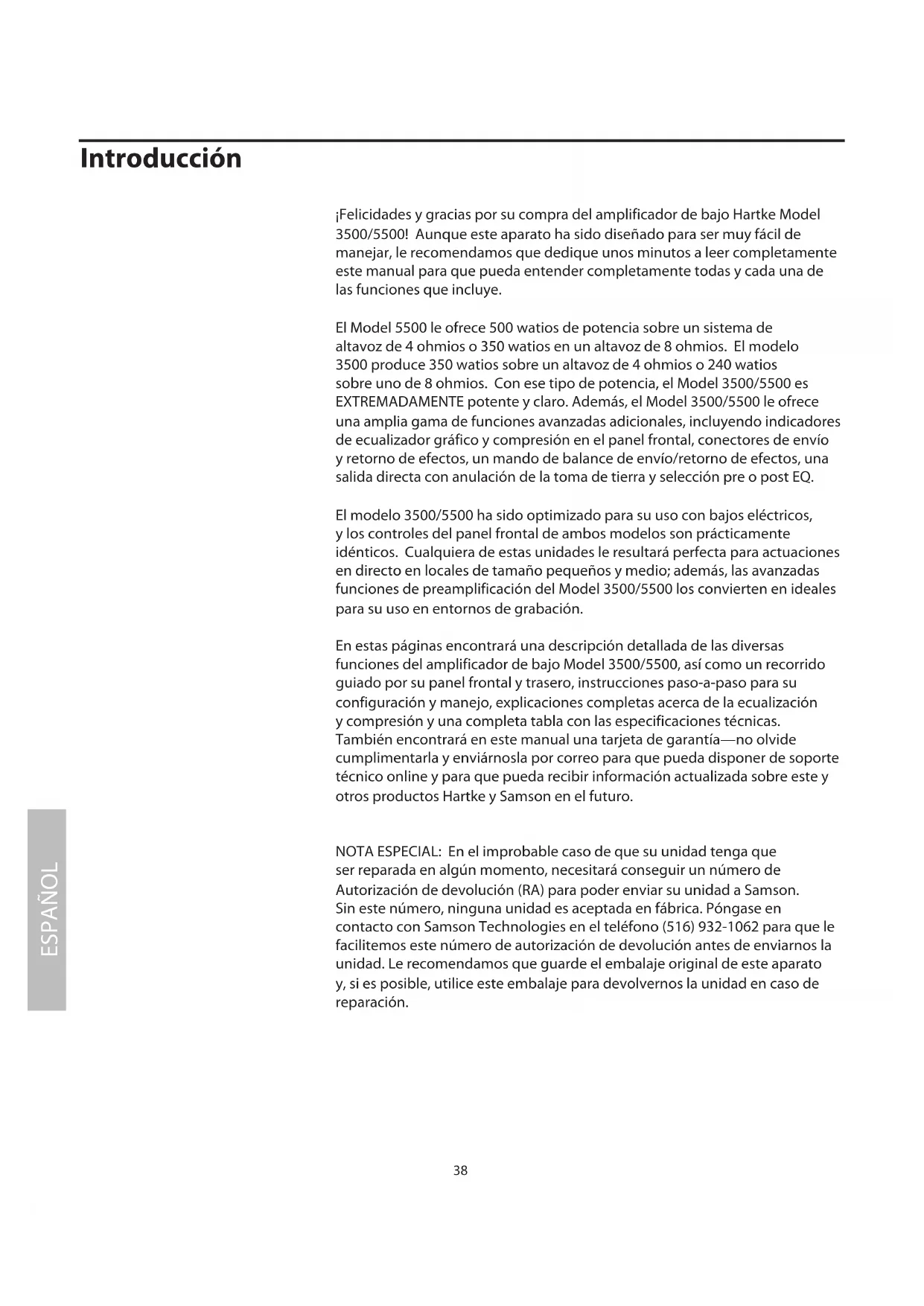 En estas páginas encontrará una descripción detallada de las diversas funciones del amplificador de bajo Model 3500/5500, así como un recorrido guiado por su panel frontal y trasero, instrucciones paso-a-paso para su configuración y manejo, explicaciones completas acerca de la ecualización y compresión y una completa tabla con las especificaciones técnicas. También encontrará en este manual una tarjeta de garantía—no olvide cumplimentarla y enviárnosla por correo para que pueda disponer de soporte técnico online y para que pueda recibir información actualizada sobre este y otros productos Hartke y Samson en el futuro.