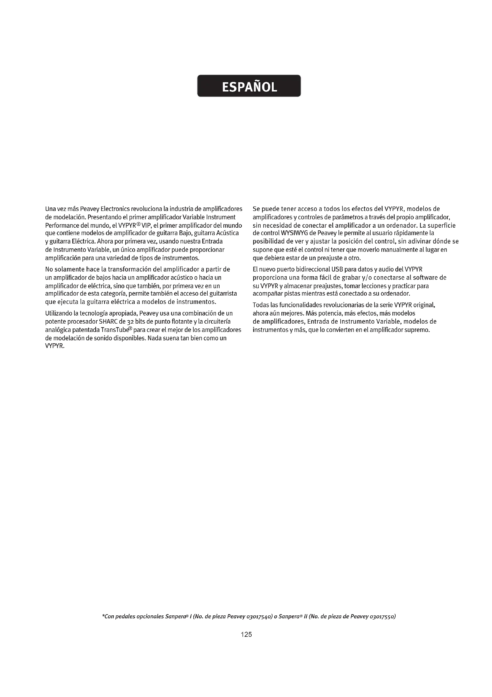 VIP Manual de operación125 ESPAÑOL Una vez más Peavey Electronics revoluciona la industria de amplificadores de modelación. Presentando el primer amplificador Variable Instrument Performance del mundo, el VYPYR