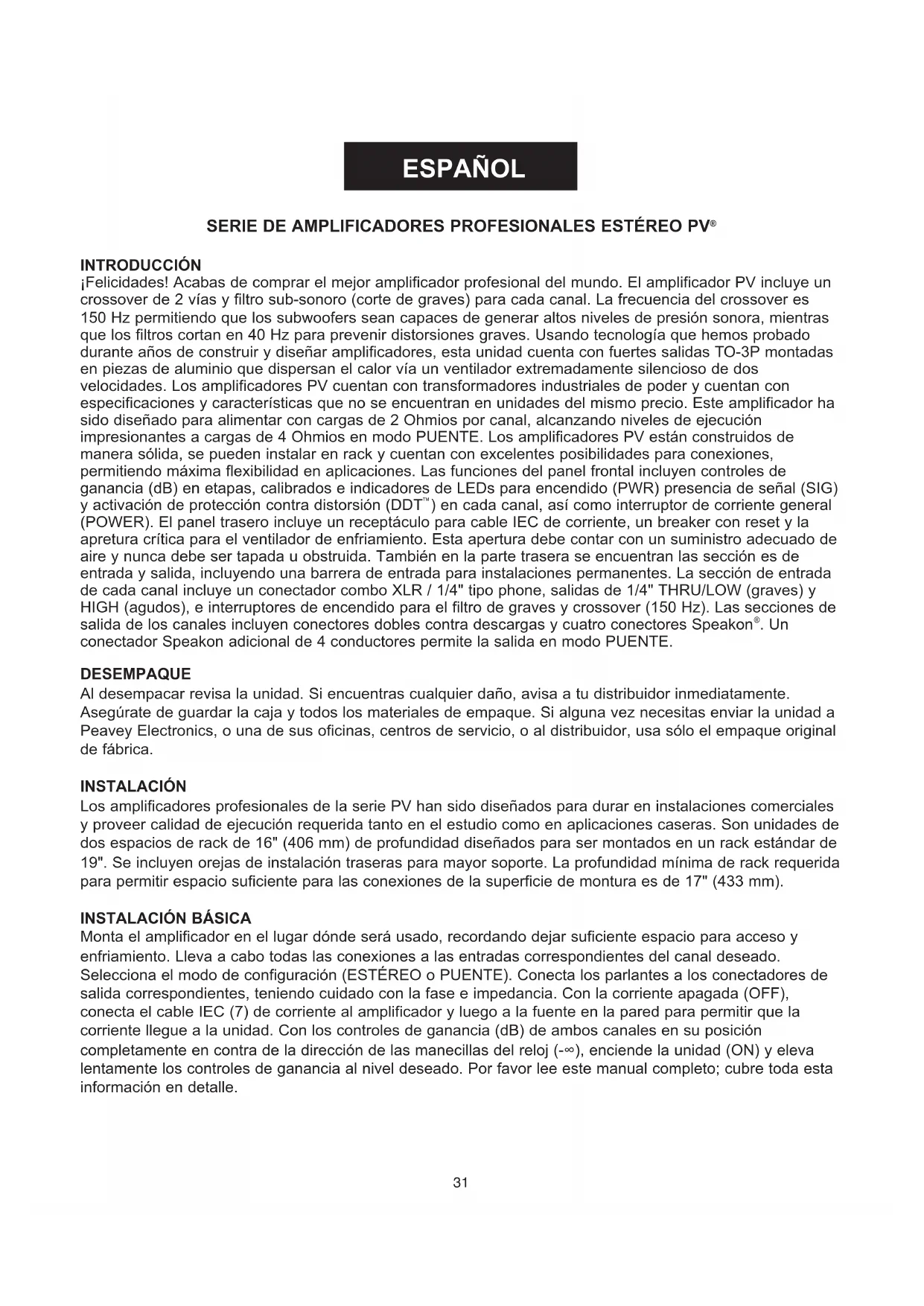 . Un conectador Speakon adicional de 4 conductores permite la salida en modo PUENTE. DESEMPAQUE Al desempacar revisa la unidad. Si encuentras cualquier daño, avisa a tu distribuidor inmediatamente. Asegúrate de guardar la caja y todos los materiales de empaque. Si alguna vez necesitas enviar la unidad a Peavey Electronics, o una de sus oficinas, centros de servicio, o al distribuidor, usa sólo el empaque original de fábrica. INSTALACIÓN Los amplificadores profesionales de la serie PV han sido diseñados para durar en instalaciones comerciales y proveer calidad de ejecución requerida tanto en el estudio como en aplicaciones caseras. Son unidades de dos espacios de rack de 16" (406 mm) de profundidad diseñados para ser montados en un rack estándar de 19". Se incluyen orejas de instalación traseras para mayor soporte. La profundidad mínima de rack requerida para permitir espacio suficiente para las conexiones de la superficie de montura es de 17" (433 mm).
