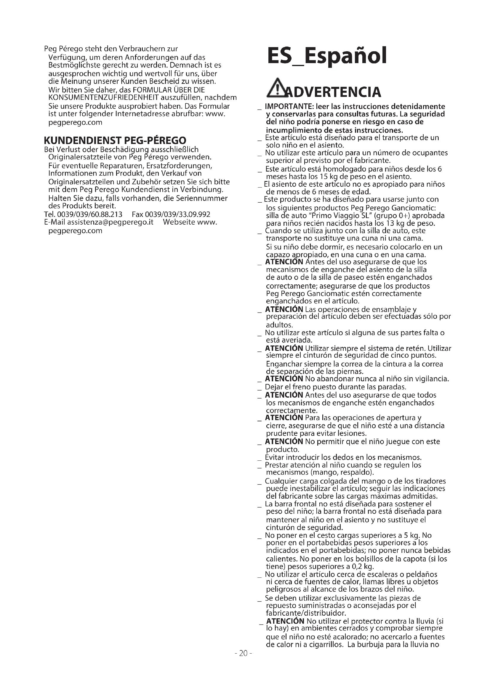 Bei Verlust oder Beschädigung ausschließlich Originalersatzteile von Peg Pérego verwenden. Für eventuelle Reparaturen, Ersatzforderungen, Informationen zum Produkt, den Verkauf von Originalersatzteilen und Zubehör setzen Sie sich bitte mit dem Peg Perego Kundendienst in Verbindung. Halten Sie dazu, falls vorhanden, die Seriennummer des Produkts bereit. Tel. 0039/039/60.88.213 Fax 0039/039/33.09.992 E-Mail assistenza@pegperego.it Webseite www. pegperego.com ES_Español ADVERTENCIA _ IMPORTANTE: leer las instrucciones detenidamente y conservarlas para consultas futuras. La seguridad del niño podría ponerse en riesgo en caso de incumplimiento de estas instrucciones. _ Este artículo está diseñado para el transporte de un solo niño en el asiento. _ No utilizar este artículo para un número de ocupantes superior al previsto por el fabricante. _ Este artículo está homologado para niños desde los 6 meses hasta los 15 kg de peso en el asiento. _ El asiento de este artículo no es apropiado para niños de menos de 6 meses de edad. _ Este producto se ha diseñado para usarse junto con los siguientes productos Peg Perego Ganciomatic: silla de auto “Primo Viaggio SL” (grupo 0+) aprobada para niños recién nacidos hasta los 13 kg de peso. _ Cuando se utiliza junto con la silla de auto, este transporte no sustituye una cuna ni una cama. Si su niño debe dormir, es necesario colocarlo en un capazo apropiado, en una cuna o en una cama. _ ATENCIÓN Antes del uso asegurarse de que los mecanismos de enganche del asiento de la silla de auto o de la silla de paseo estén enganchados correctamente; asegurarse de que los productos Peg Perego Ganciomatic estén correctamente enganchados en el artículo. _ ATENCIÓN Las operaciones de ensamblaje y preparación del artículo deben ser efectuadas sólo por adultos. _ No utilizar este artículo si alguna de sus partes falta o está averiada. _ ATENCIÓN Utilizar siempre el sistema de retén. Utilizar siempre el cinturón de seguridad de cinco puntos. Enganchar siempre la correa de la cintura a la correa de separación de las piernas. _ ATENCIÓN No abandonar nunca al niño sin vigilancia. _ Dejar el freno puesto durante las paradas. _ ATENCIÓN Antes del uso asegurarse de que todos los mecanismos de enganche estén enganchados correctamente. _ ATENCIÓN Para las operaciones de apertura y cierre, asegurarse de que el niño esté a una distancia prudente para evitar lesiones. _ ATENCIÓN No permitir que el niño juegue con este producto. _ Evitar introducir los dedos en los mecanismos. _ Prestar atención al niño cuando se regulen los mecanismos (mango, respaldo). _ Cualquier carga colgada del mango o de los tiradores puede inestabilizar el artículo; seguir las indicaciones del fabricante sobre las cargas máximas admitidas. _ La barra frontal no está diseñada para sostener el peso del niño; la barra frontal no está diseñada para mantener al niño en el asiento y no sustituye el cinturón de seguridad. _ No poner en el cesto cargas superiores a 5 kg. No poner en el portabebidas pesos superiores a los indicados en el portabebidas; no poner nunca bebidas calientes. No poner en los bolsillos de la capota (si los tiene) pesos superiores a 0,2 kg. _ No utilizar el artículo cerca de escaleras o peldaños ni cerca de fuentes de calor, llamas libres u objetos peligrosos al alcance de los brazos del niño. _ Se deben utilizar exclusivamente las piezas de repuesto suministradas o aconsejadas por el fabricante/distribuidor. _ ATENCIÓN No utilizar el protector contra la lluvia (si lo hay) en ambientes cerrados y comprobar siempre que el niño no esté acalorado; no acercarlo a fuentes de calor ni a cigarrillos. La burbuja para la lluvia no- 21 - se debe utilizar en un cochecito que no tenga una capota o un parasol para montarla. La burbuja para la lluvia se debe utilizar sólo y exclusivamente bajo la vigilancia de un adulto.Asegurarse de que el protector contra la lluvia no interfiera con ningún mecanismo móvil del carrito o de la silla de paseo; quitar siempre el protector contra la lluvia antes de cerrar el carrito o la silla de paseo. _ ATENCIÓN Este artículo no es adecuado para ir patinando o corriendo. _ No añadir un colchón no aprobado por el fabricante. _ ATENCIÓN No añadir colchones. _ No utilizar accesorios no aprobados por el constructor.