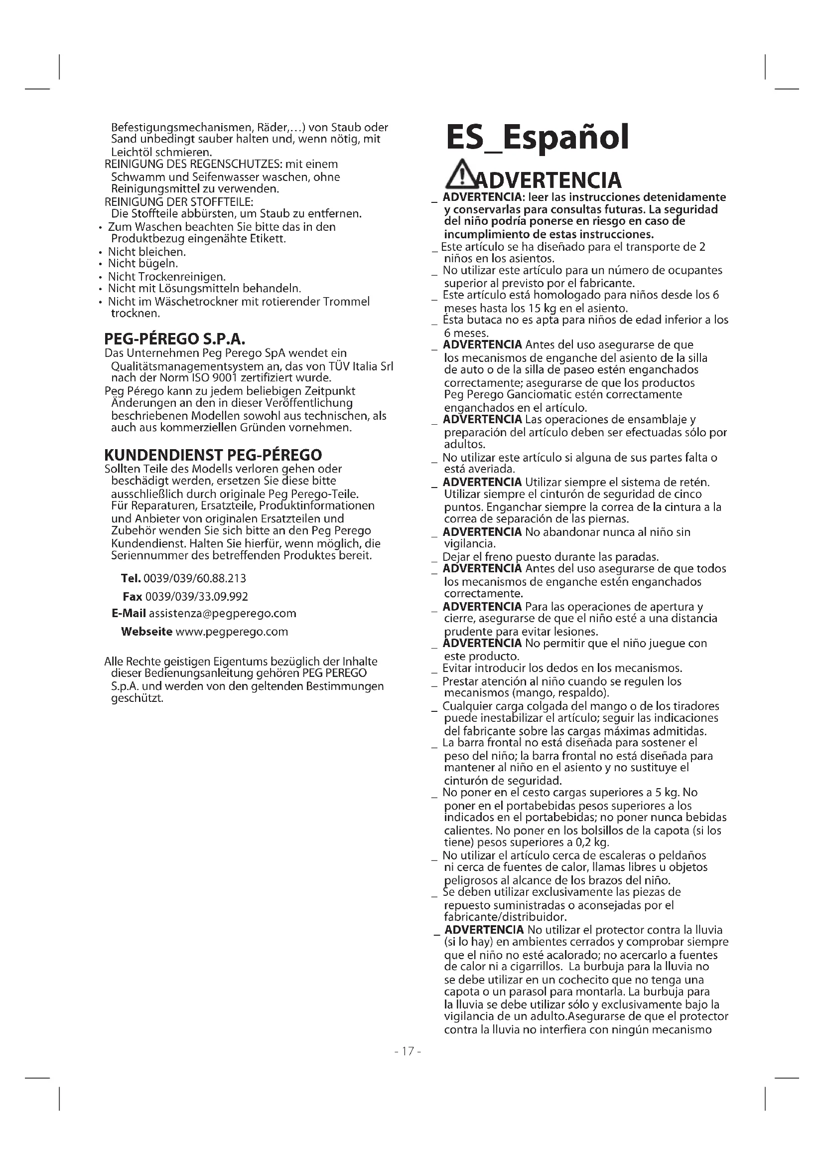 Sollten Teile des Modells verloren gehen oder beschädigt werden, ersetzen Sie diese bitte ausschließlich durch originale Peg Perego-Teile. Für Reparaturen, Ersatzteile, Produktinformationen und Anbieter von originalen Ersatzteilen und Zubehör wenden Sie sich bitte an den Peg Perego Kundendienst. Halten Sie hierfür, wenn möglich, die Seriennummer des betreffenden Produktes bereit. Tel. 0039/039/60.88.213 Fax 0039/039/33.09.992 E-Mail assistenza@pegperego.com Webseite www.pegperego.com Alle Rechte geistigen Eigentums bezüglich der Inhalte dieser Bedienungsanleitung gehören PEG PEREGO S.p.A. und werden von den geltenden Bestimmungen geschützt. ES_Español ADVERTENCIA _ ADVERTENCIA: leer las instrucciones detenidamente y conservarlas para consultas futuras. La seguridad del niño podría ponerse en riesgo en caso de incumplimiento de estas instrucciones. _ Este artículo se ha diseñado para el transporte de 2 niños en los asientos. _ No utilizar este artículo para un número de ocupantes superior al previsto por el fabricante. _ Este artículo está homologado para niños desde los 6 meses hasta los 15 kg en el asiento. _ Ésta butaca no es apta para niños de edad inferior a los 6 meses. _ ADVERTENCIA Antes del uso asegurarse de que los mecanismos de enganche del asiento de la silla de auto o de la silla de paseo estén enganchados correctamente; asegurarse de que los productos Peg Perego Ganciomatic estén correctamente enganchados en el artículo. _ ADVERTENCIA Las operaciones de ensamblaje y preparación del artículo deben ser efectuadas sólo por adultos. _ No utilizar este artículo si alguna de sus partes falta o está averiada. _ ADVERTENCIA Utilizar siempre el sistema de retén. Utilizar siempre el cinturón de seguridad de cinco puntos. Enganchar siempre la correa de la cintura a la correa de separación de las piernas. _ ADVERTENCIA No abandonar nunca al niño sin vigilancia. _ Dejar el freno puesto durante las paradas. _ ADVERTENCIA Antes del uso asegurarse de que todos los mecanismos de enganche estén enganchados correctamente. _ ADVERTENCIA Para las operaciones de apertura y cierre, asegurarse de que el niño esté a una distancia prudente para evitar lesiones. _ ADVERTENCIA No permitir que el niño juegue con este producto. _ Evitar introducir los dedos en los mecanismos. _ Prestar atención al niño cuando se regulen los mecanismos (mango, respaldo). _ Cualquier carga colgada del mango o de los tiradores puede inestabilizar el artículo; seguir las indicaciones del fabricante sobre las cargas máximas admitidas. _ La barra frontal no está diseñada para sostener el peso del niño; la barra frontal no está diseñada para mantener al niño en el asiento y no sustituye el cinturón de seguridad. _ No poner en el cesto cargas superiores a 5 kg. No poner en el portabebidas pesos superiores a los indicados en el portabebidas; no poner nunca bebidas calientes. No poner en los bolsillos de la capota (si los tiene) pesos superiores a 0,2 kg. _ No utilizar el artículo cerca de escaleras o peldaños ni cerca de fuentes de calor, llamas libres u objetos peligrosos al alcance de los brazos del niño. _ Se deben utilizar exclusivamente las piezas de repuesto suministradas o aconsejadas por el fabricante/distribuidor. _ ADVERTENCIA No utilizar el protector contra la lluvia (si lo hay) en ambientes cerrados y comprobar siempre que el niño no esté acalorado; no acercarlo a fuentes de calor ni a cigarrillos. La burbuja para la lluvia no se debe utilizar en un cochecito que no tenga una capota o un parasol para montarla. La burbuja para la lluvia se debe utilizar sólo y exclusivamente bajo la vigilancia de un adulto.Asegurarse de que el protector contra la lluvia no interfiera con ningún mecanismo- 18 - móvil del carrito o de la silla de paseo; quitar siempre el protector contra la lluvia antes de cerrar el carrito o la silla de paseo. _ ADVERTENCIA Este artículo no es adecuado para ir patinando o corriendo. _ No añadir un colchón no aprobado por el fabricante. _ ADVERTENCIA No añadir colchones. _ No utilizar accesorios no aprobados por el constructor. Las imágenes referidas a los detalles textiles pueden diferir de la colección comprada. Consulte nuestro sitio web para obtener más información:www.pegperego.com