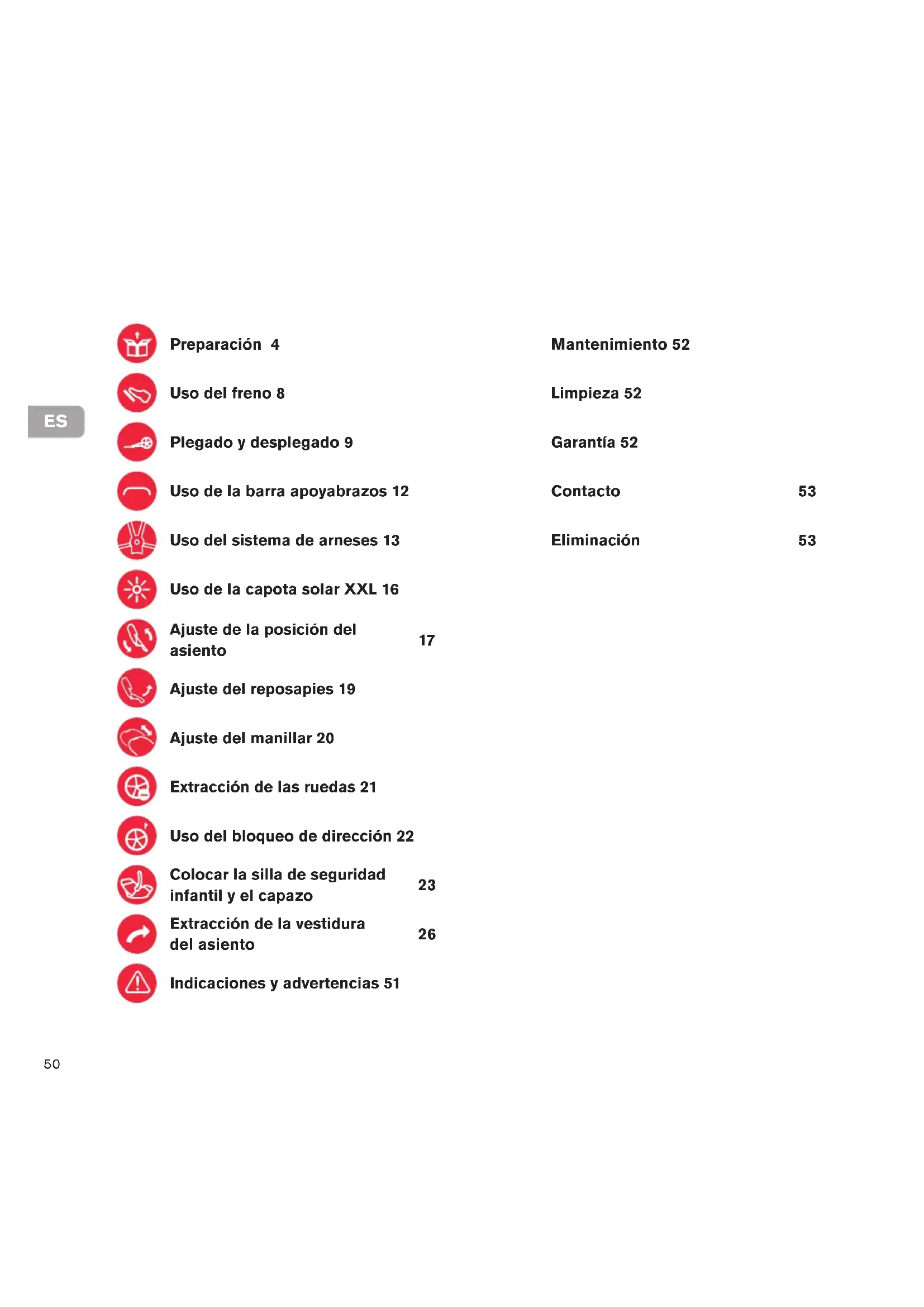 Preparación 4 Uso del freno 8 Plegado y desplegado 9 Uso de la barra apoyabrazos 12 Uso del sistema de arneses 13 Uso de la capota solar XXL 16 Ajuste de la posición del asiento