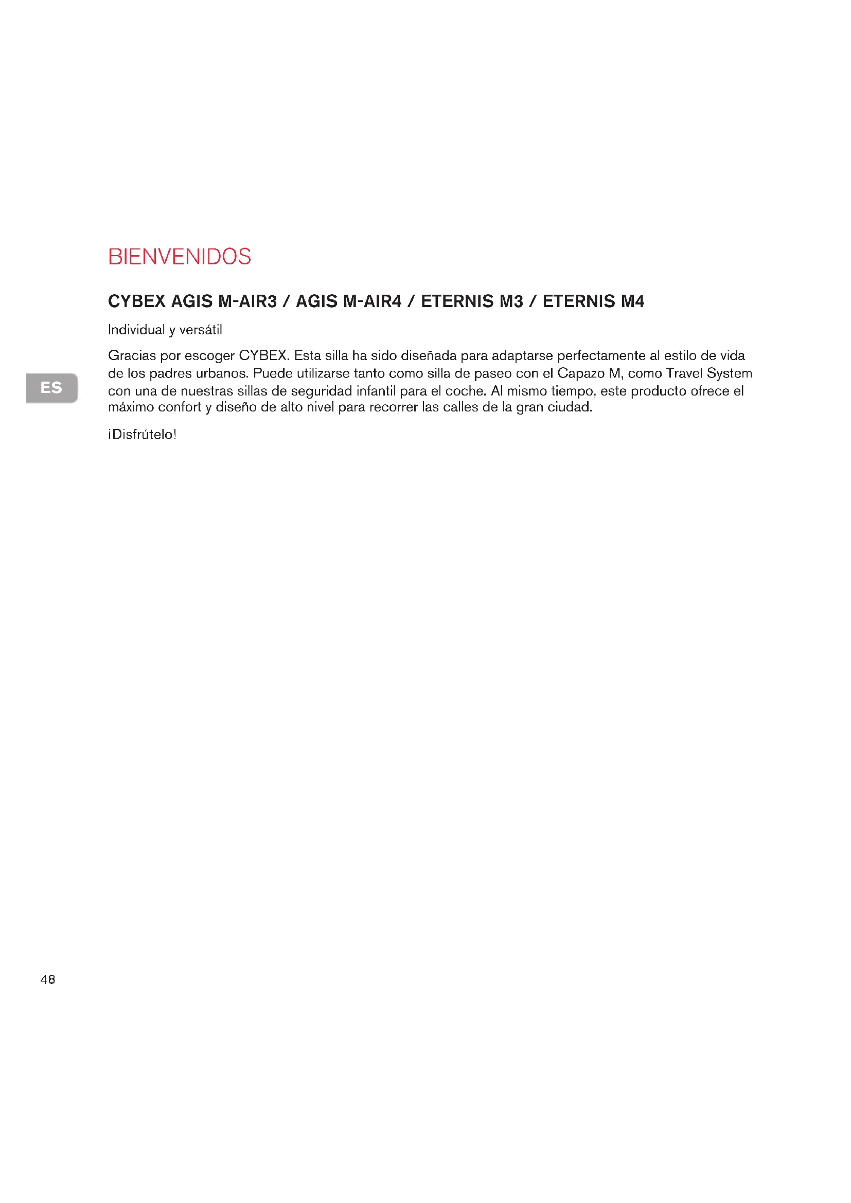 Bienvenidos CYBEX Agis M-Air3 / Agis M-Air4 / EtErnis M3 / EtErnis M4 Individual y versátil Gracias por escoger CYBEX. Esta silla ha sido diseñada para adaptarse perfectamente al estilo de vida de los padres urbanos. Puede utilizarse tanto como silla de paseo con el Capazo M, como Travel System con una de nuestras sillas de seguridad infantil para el coche. Al mismo tiempo, este producto ofrece el máximo confort y diseño de alto nivel para recorrer las calles de la gran ciudad. ¡Disfrútelo!ES
