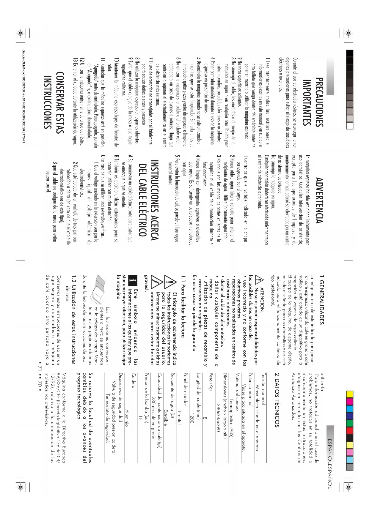 Caldera Aluminio Dispositivos de seguridad Válvula de seguridad presión caldera; Termostato de seguridad. Se reserva la facultad de eventuales cambios debido a los avances del progreso tecnológico. Máquina conforme a la Directiva Europea 89/336/CEE (Decreto legislativo 476 del 04/ 12/92), relativa a la eliminación de las molestias radiotelevisivas. Gaggia-OEM1-cod 165892100 rev.01.PMD 06/06/2002, 20.3170-71ESPAÑOLESPAÑOL