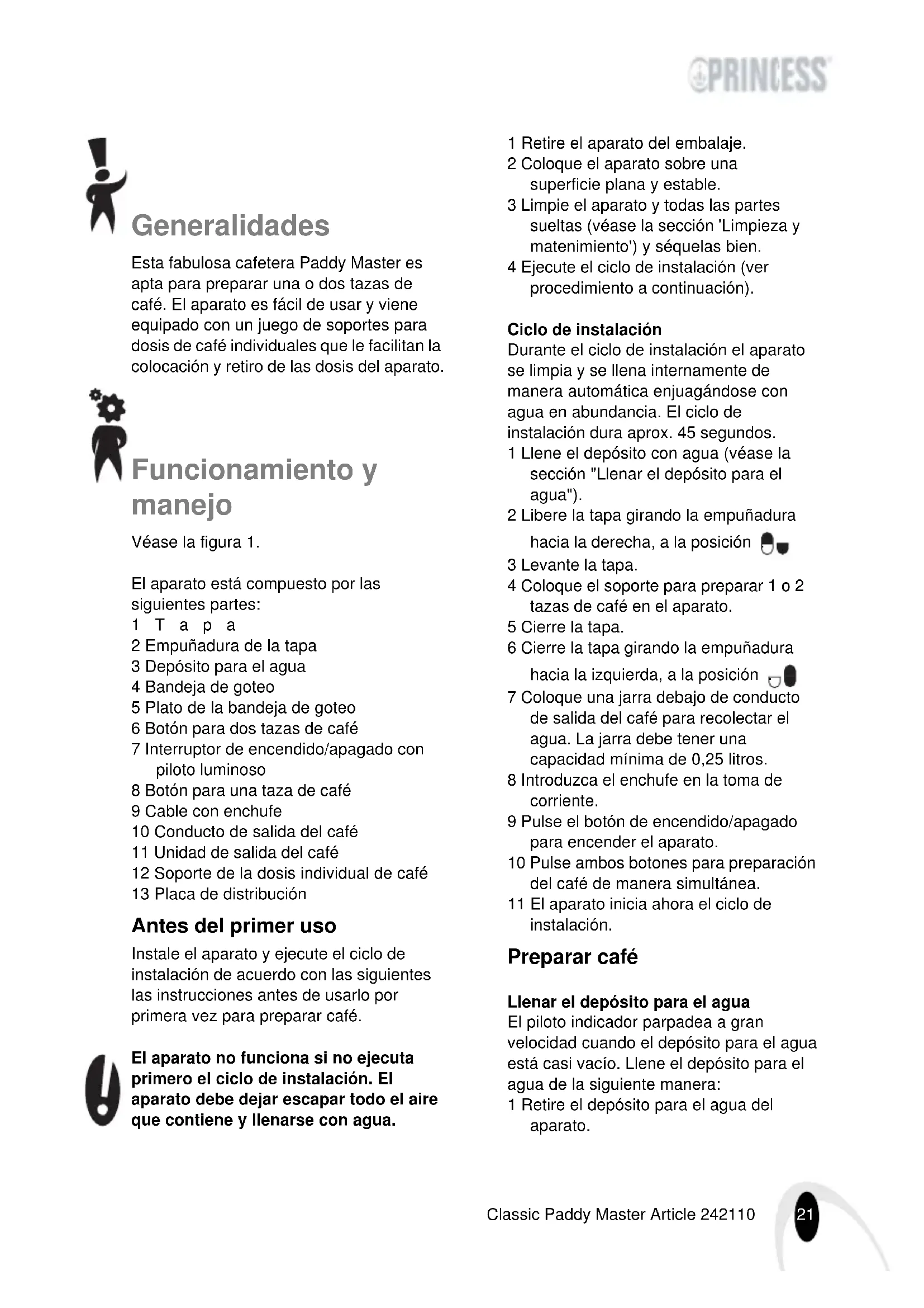 - 2002/96/EG Princess_Classic_Paddy_Master_242110.book Page 20 Thursday, November 1, 2007 2:19 PM21 Classic Paddy Master Article 242110 Generalidades Esta fabulosa cafetera Paddy Master es apta para preparar una o dos tazas de café. El aparato es fácil de usar y viene equipado con un juego de soportes para dosis de café individuales que le facilitan la colocación y retiro de las dosis del aparato. Funcionamiento y manejo Véase la figura 1. El aparato está compuesto por las siguientes partes: 1Tapa 2 Empuñadura de la tapa 3 Depósito para el agua 4 Bandeja de goteo 5 Plato de la bandeja de goteo 6 Botón para dos tazas de café 7 Interruptor de encendido/apagado con piloto luminoso 8 Botón para una taza de café 9 Cable con enchufe 10 Conducto de salida del café 11 Unidad de salida del café 12 Soporte de la dosis individual de café 13 Placa de distribución Antes del primer uso Instale el aparato y ejecute el ciclo de instalación de acuerdo con las siguientes las instrucciones antes de usarlo por primera vez para preparar café. El aparato no funciona si no ejecuta primero el ciclo de instalación. El aparato debe dejar escapar todo el aire que contiene y llenarse con agua. 1 Retire el aparato del embalaje. 2 Coloque el aparato sobre una superficie plana y estable. 3 Limpie el aparato y todas las partes sueltas (véase la sección 'Limpieza y matenimiento') y séquelas bien. 4 Ejecute el ciclo de instalación (ver procedimiento a continuación). Ciclo de instalación Durante el ciclo de instalación el aparato se limpia y se llena internamente de manera automática enjuagándose con agua en abundancia. El ciclo de instalación dura aprox. 45 segundos. 1 Llene el depósito con agua (véase la sección "Llenar el depósito para el agua"). 2 Libere la tapa girando la empuñadura hacia la derecha, a la posición . 3 Levante la tapa. 4 Coloque el soporte para preparar 1 o 2 tazas de café en el aparato. 5 Cierre la tapa. 6 Cierre la tapa girando la empuñadura hacia la izquierda, a la posición . 7 Coloque una jarra debajo de conducto de salida del café para recolectar el agua. La jarra debe tener una capacidad mínima de 0,25 litros. 8 Introduzca el enchufe en la toma de corriente. 9 Pulse el botón de encendido/apagado para encender el aparato. 10 Pulse ambos botones para preparación del café de manera simultánea. 11 El aparato inicia ahora el ciclo de instalación. Preparar café Llenar el depósito para el agua El piloto indicador parpadea a gran velocidad cuando el depósito para el agua está casi vacío. Llene el depósito para el agua de la siguiente manera: 1 Retire el depósito para el agua del aparato. Princess_Classic_Paddy_Master_242110.book Page 21 Thursday, November 1, 2007 2:19 PM22 Classic Paddy Master Article 242110 2 Llene el depósito con agua fría hasta la indicación MAX. 3 Vuelva a colocar el depósito para el agua en el aparato. Preparar café