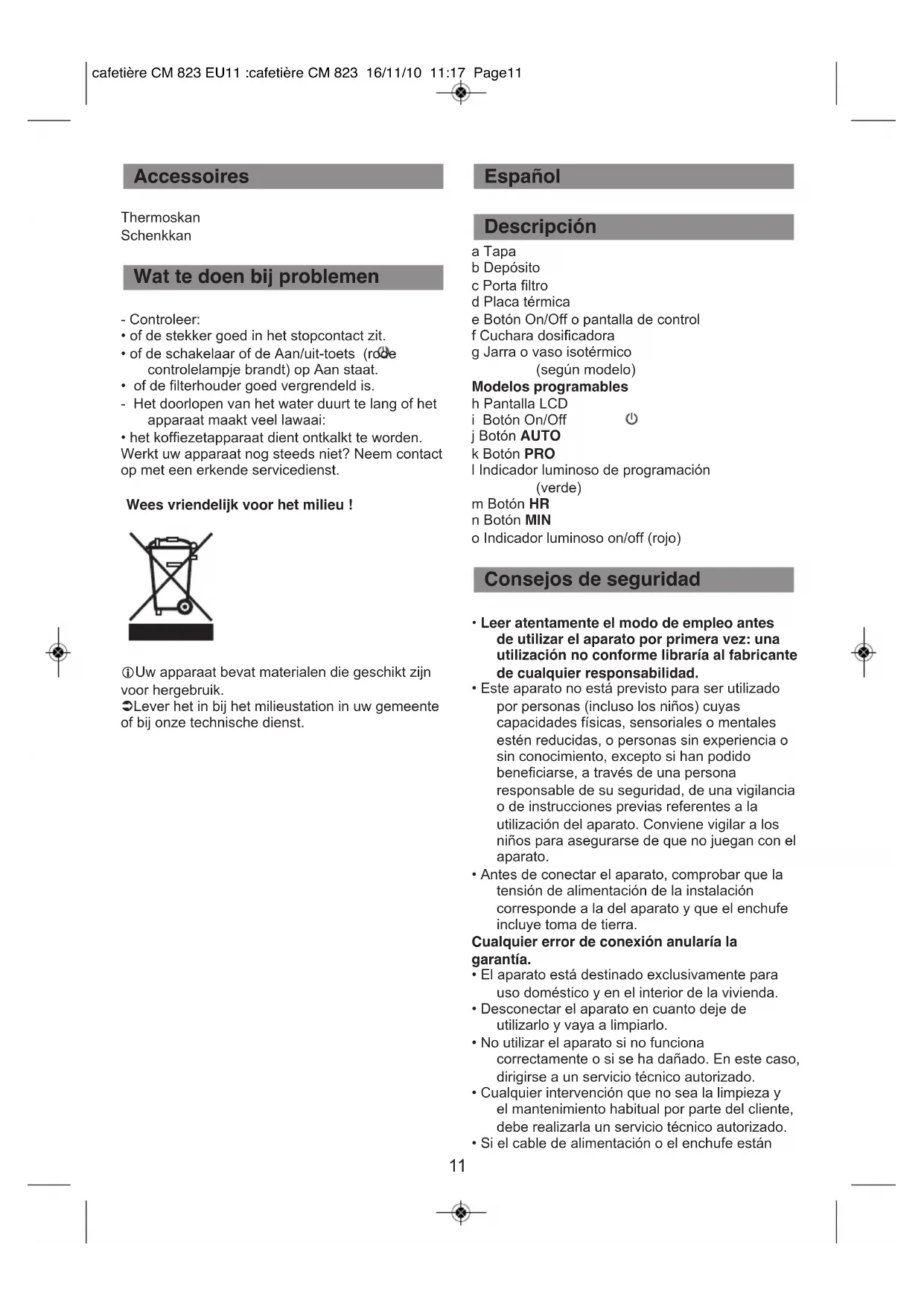 - Si el cable de alimentación o el enchufe están Español Descripción Consejos de seguridad Wat te doen bij problemen Accessoires cafetière CM 823 EU11 :cafetière CM 823 16/11/10 11:17 Page1112 dañados, no utilice el aparato. Para evitar cualquier peligro, lleve a remplazar el cable de alimentación a un servicio técnico autorizado.