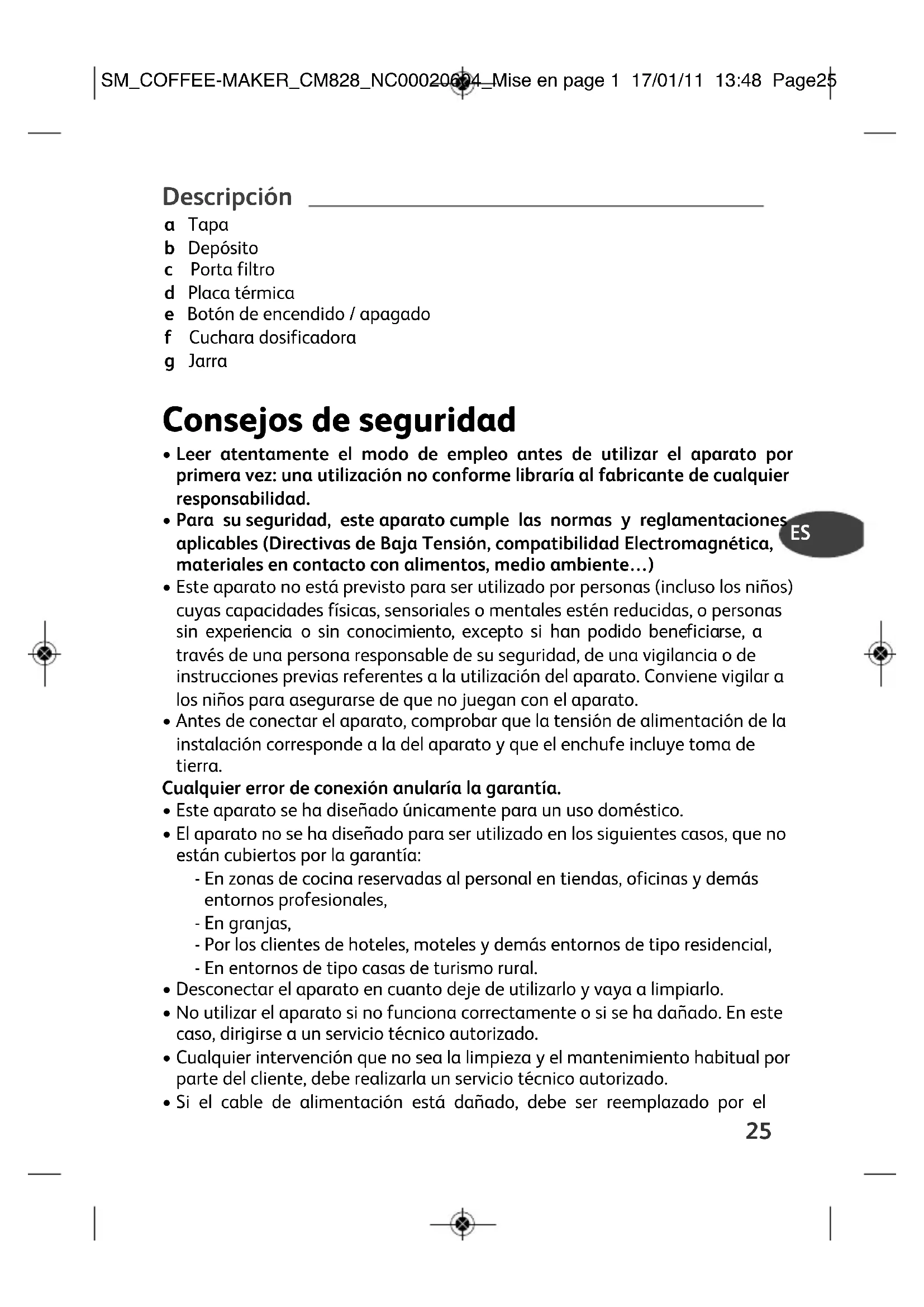 - Si el cable de alimentación está dañado, debe ser reemplazado por el SM_COFFEE-MAKER_CM828_NC00020604_Mise en page 1 17/01/11 13:48 Page2526 fabricante, el servicio post-venta o una persona de cualificación similar para poder evitar cualquier peligro.