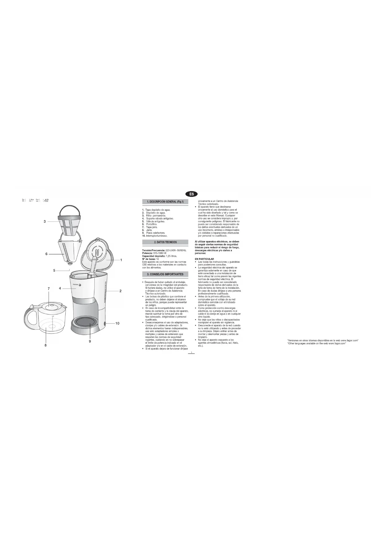 Tensión/Frecuencia: 220-240V~50/60Hz. Potencia: 915-1080 W. Capacidad depósito: 1,25 litros. Nº de tazas: 12 Este aparato es conforme con las normas CEE relativas a los materiales en contacto con los alimentos.