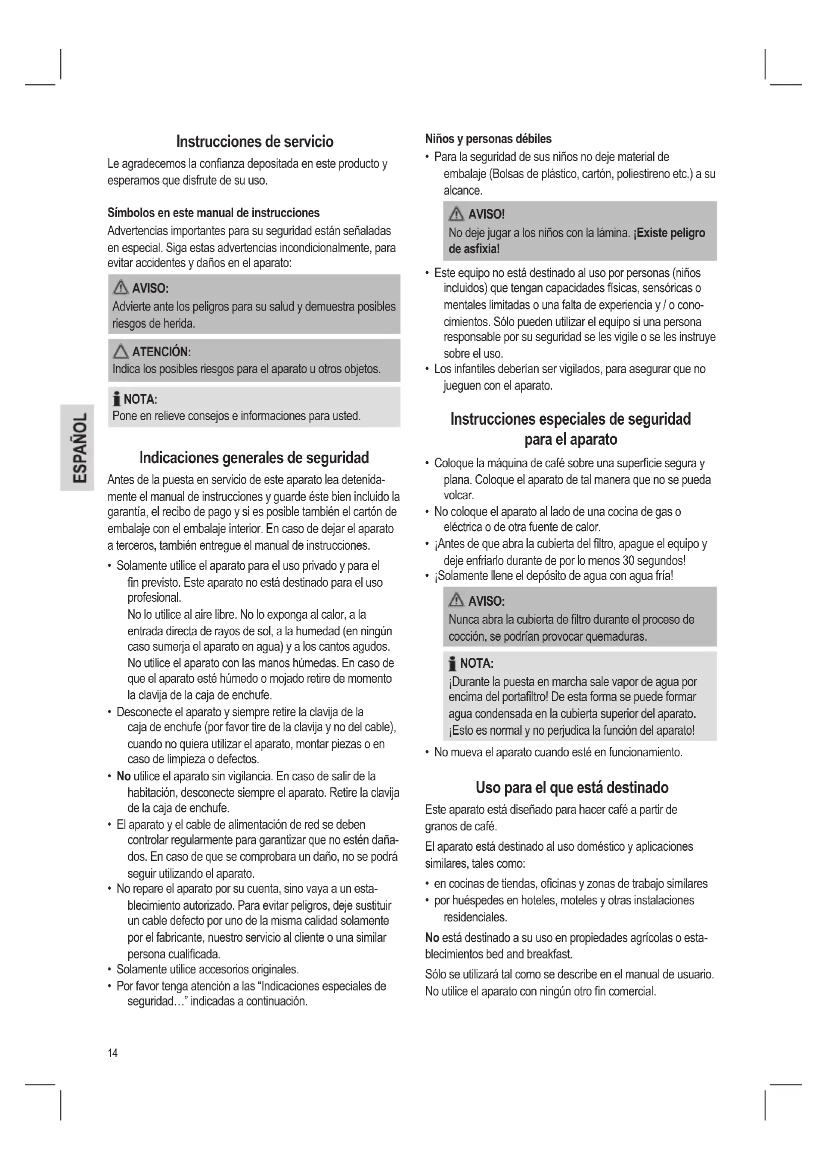 - por huéspedes en hoteles, moteles y otras instalaciones residenciales. No está destinado a su uso en propiedades agrícolas o esta- blecimientos bed and breakfast. Sólo se utilizará tal como se describe en el manual de usuario. No utilice el aparato con ningún otro n comercial. Instrucciones de servicio Le agradecemos la conanza depositada en este producto y esperamos que disfrute de su uso. Símbolos en este manual de instrucciones Advertencias importantes para su seguridad están señaladas en especial. Siga estas advertencias incondicionalmente, para evitar accidentes y daños en el aparato: AVISO: Advierte ante los peligros para su salud y demuestra posibles riesgos de herida. ATENCIÓN: Indica los posibles riesgos para el aparato u otros objetos. NOTA: Pone en relieve consejos e informaciones para usted. Indicaciones generales de seguridad Antes de la puesta en servicio de este aparato lea detenida- mente el manual de instrucciones y guarde éste bien incluido la garantía, el recibo de pago y si es posible también el cartón de embalaje con el embalaje interior. En caso de dejar el aparato a terceros, también entregue el manual de instrucciones.