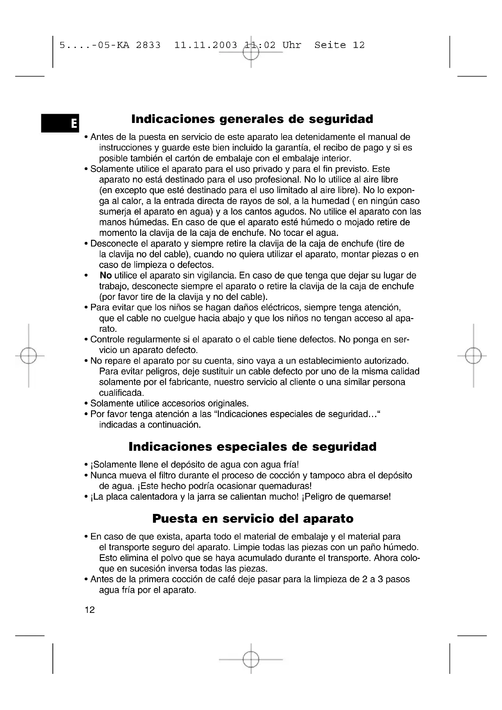 5....-05-KA 2833 11.11.2003 11:02 Uhr Seite 134. No sumerja la jarra en agua. Limpie la jarra por afuera con un paño humedeci- do. Por adentro puede enjuagar la jarra con agua templada. En caso de que sea necesario utilice un cepillo suave. Este aparato se ha examinado según las normativas actuales y vigentes de la Comunidad Europea, como p.ej. compatibilidad electromagnética y directiva de baja tensión y se ha construido según las más nuevas especificaciones en razón de la seguridad. No reservamos el derecho de efectuar modificaciones técnicas. Garantía Para el aparato comercializado por nosotros nos responsabilizamos con una garantía de 24 meses a partir de la fecha de compra (factura de compra). Durante el período de garantía nos encargamos gratuítamente de los defectos del aparato y de los accesorios*), que se hayan originado por defectos del material o de la fabricación. Dependiendo de nuestra estimación se realizará una reparación o un cambio. ¡Los servicios de garantía no prolangan la garantía, ni se incia por ello un período nuevo de garantía! Como comprobante para la garantía es válido la factura de compra. Sin este com- probante no se podrá realizar un cambio o una reparación gratuíta. En caso de garantía entregue el aparato completo en su embalaje original junto con la factura a su agente comerciante. *) Defectos en las piezas de accesorio, no significan automáticamente el recambio gratuito del aparato completo. ¡En este caso dirijase por favor a nuestra linea de atención al cliente! ¡Rotos de vidrio o roturas en las piezas de plástico deben pagarse siempre por el cliente ! Defectos en los accesorios de uso o en las piezas de desgaste (p.ej. escobillas de carbón del motor, varillas amasadoras, correas de transmisión, mando a distancia de repuesto, cepillos de dientes de repuesto, hojas de sierra etc.), como también la limpieza, mantenimiento o el recambio de piezas de desgaste no recaen en la garantía e irán al cargo del cliente! En caso de intervención ajena se expira la garantía. Después de la garantía Después de haber expirado la garantía se pueden realizar las reparaciones por el concesionario o por el servicio de reparaciones. Los gastos irán al cargo del cliente.