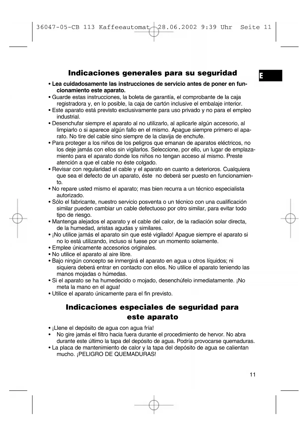 36047-05-CB 113 Kaffeeautomat 28.06.2002 9:39 Uhr Seite 12Este aparato responde a las directivas de CE para la supresión de interferencias y la seguridad de baja tensión y ha sido construido según las últimas prescripciones de seguridad técnica. No reservamos el derecho de efectuar modificaciones técnicas. Garantía Este producto está garantizado por nosotros durante 24 meses a partir de la fecha de adquisición (factura de compra). En el tiempo de garantía nos hacemos cargo de eliminar gratuitamente mediante reparación o cambio todos los defectos del aparato debidos a una imperfecta fabri- cación o a los materiales. La garantía tendrá validez con la factura de compra. Si no dispone de la factura no se podrá realizar el cambio o la reparación de forma gratuita. En caso de garantía debe llevar el producto completo con el embalaje original y la factura de compra a su establecimiento de adquisición. En caso de rotura de cristal y defectos en los accesorios no se cambia el aparato, sino se recambian los accesorios en envío gratuito. ¡En este caso no envíe todo el aparato, sino encargue solamente la pieza defecta! La limpieza, el mantenimiento o el cambio de piezas que se desgastan no entran en la garantía y deben ser abonados por usted. La garantía no tendrá validez si el defecto es ocasionado por tercera personas. Después de la garantía Cuando se haya expirado la garantía las reparaciones se realizan por el comercio especializado o el servicio al cliente y serán abonados por usted.