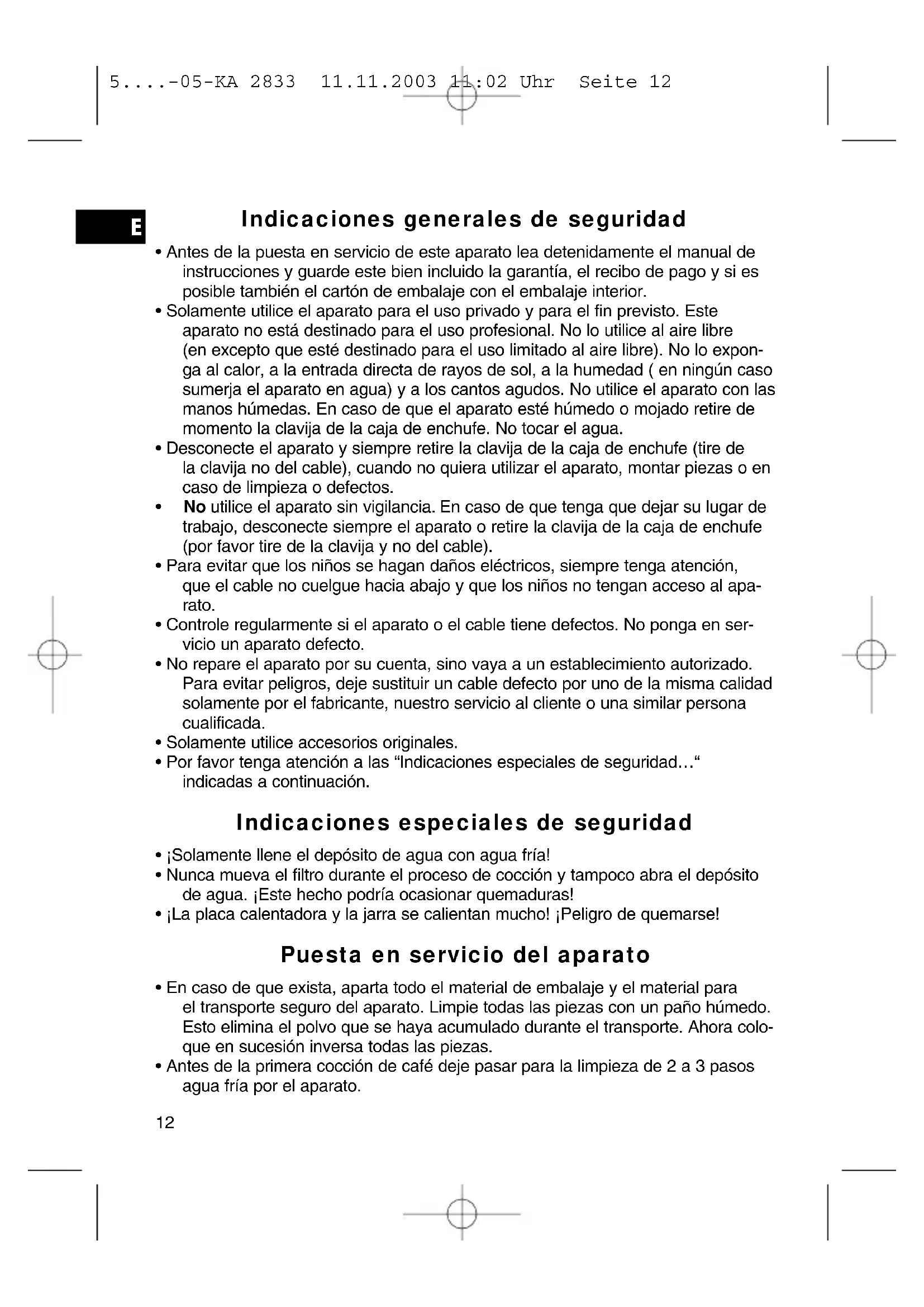 5....-05-KA 2833 11.11.2003 11:02 Uhr Seite 134. No sumerja la jarra en agua. Limpie la jarra por afuera con un paño humedeci- do. Por adentro puede enjuagar la jarra con agua templada. En caso de que sea necesario utilice un cepillo suave. Este aparato se ha examinado según las normativas actuales y vigentes de la Comunidad Europea, como p.ej. compatibilidad electromagnética y directiva de baja tensión y se ha construido según las más nuevas especificaciones en razón de la seguridad. No reservamos el derecho de efectuar modificaciones técnicas. Garantía Para el aparato comercializado por nosotros nos responsabilizamos con una garantía de 24 meses a partir de la fecha de compra (factura de compra). Durante el período de garantía nos encargamos gratuítamente de los defectos del aparato y de los accesorios*), que se hayan originado por defectos del material o de la fabricación. Dependiendo de nuestra estimación se realizará una reparación o un cambio. ¡Los servicios de garantía no prolangan la garantía, ni se incia por ello un período nuevo de garantía! Como comprobante para la garantía es válido la factura de compra. Sin este com- probante no se podrá realizar un cambio o una reparación gratuíta. En caso de garantía entregue el aparato completo en su embalaje original junto con la factura a su agente comerciante. *) Defectos en las piezas de accesorio, no significan automáticamente el recambio gratuito del aparato completo. ¡En este caso dirijase por favor a nuestra linea de atención al cliente! ¡Rotos de vidrio o roturas en las piezas de plástico deben pagarse siempre por el cliente ! Defectos en los accesorios de uso o en las piezas de desgaste (p.ej. escobillas de carbón del motor, varillas amasadoras, correas de transmisión, mando a distancia de repuesto, cepillos de dientes de repuesto, hojas de sierra etc.), como también la limpieza, mantenimiento o el recambio de piezas de desgaste no recaen en la garantía e irán al cargo del cliente! En caso de intervención ajena se expira la garantía. Después de la garantía Después de haber expirado la garantía se pueden realizar las reparaciones por el concesionario o por el servicio de reparaciones. Los gastos irán al cargo del cliente.